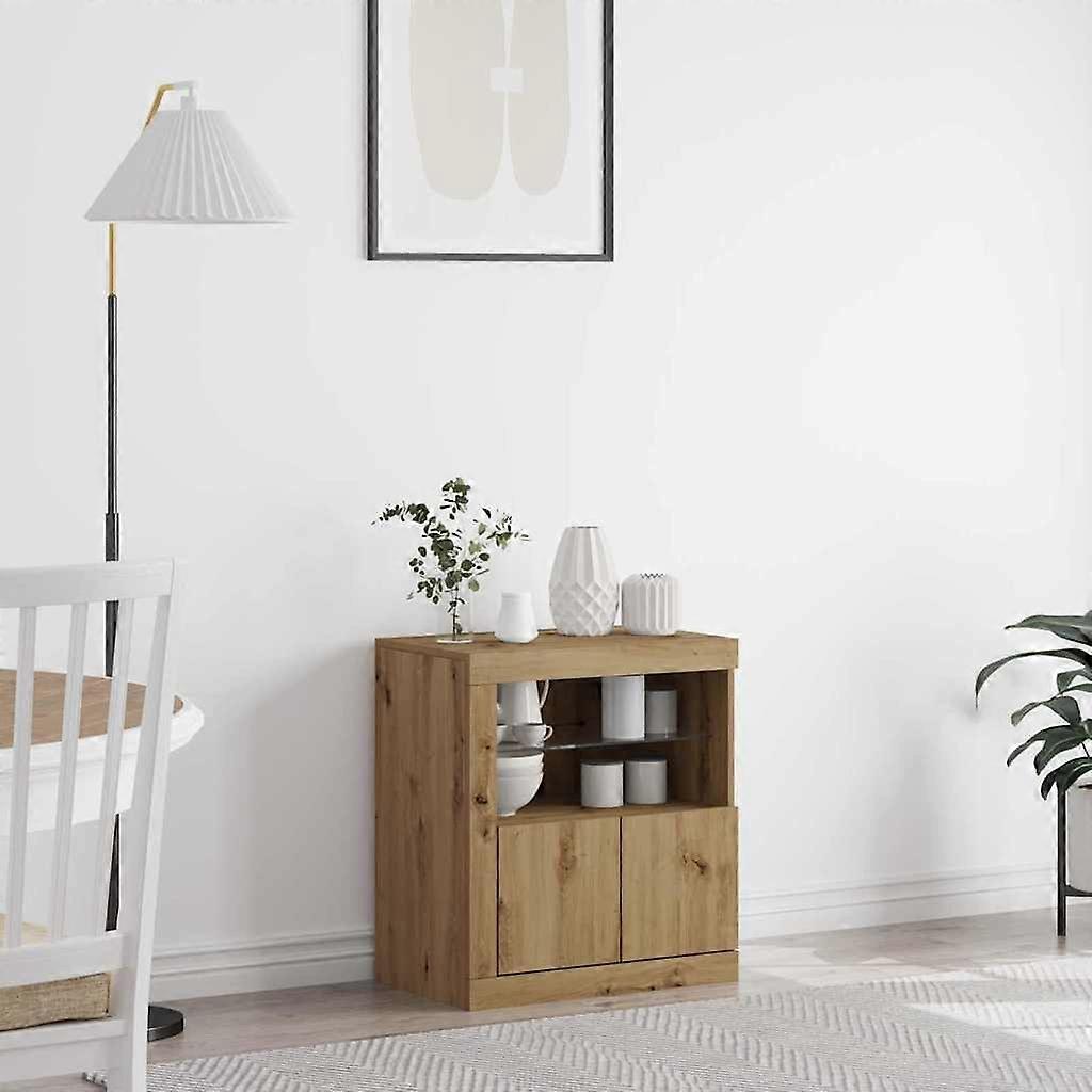 Farbe: BraunMaterial: HolzwerkstoffGesamtabmessungen: 60,5 x 37 x 67 cm (L x B x H)mit 2 Flächenbündige TürenLanglebigRGB LED-StreifenlichterMit GlasregalenMontage erforderlich: JaLieferumfang:1 x LED Sideboard