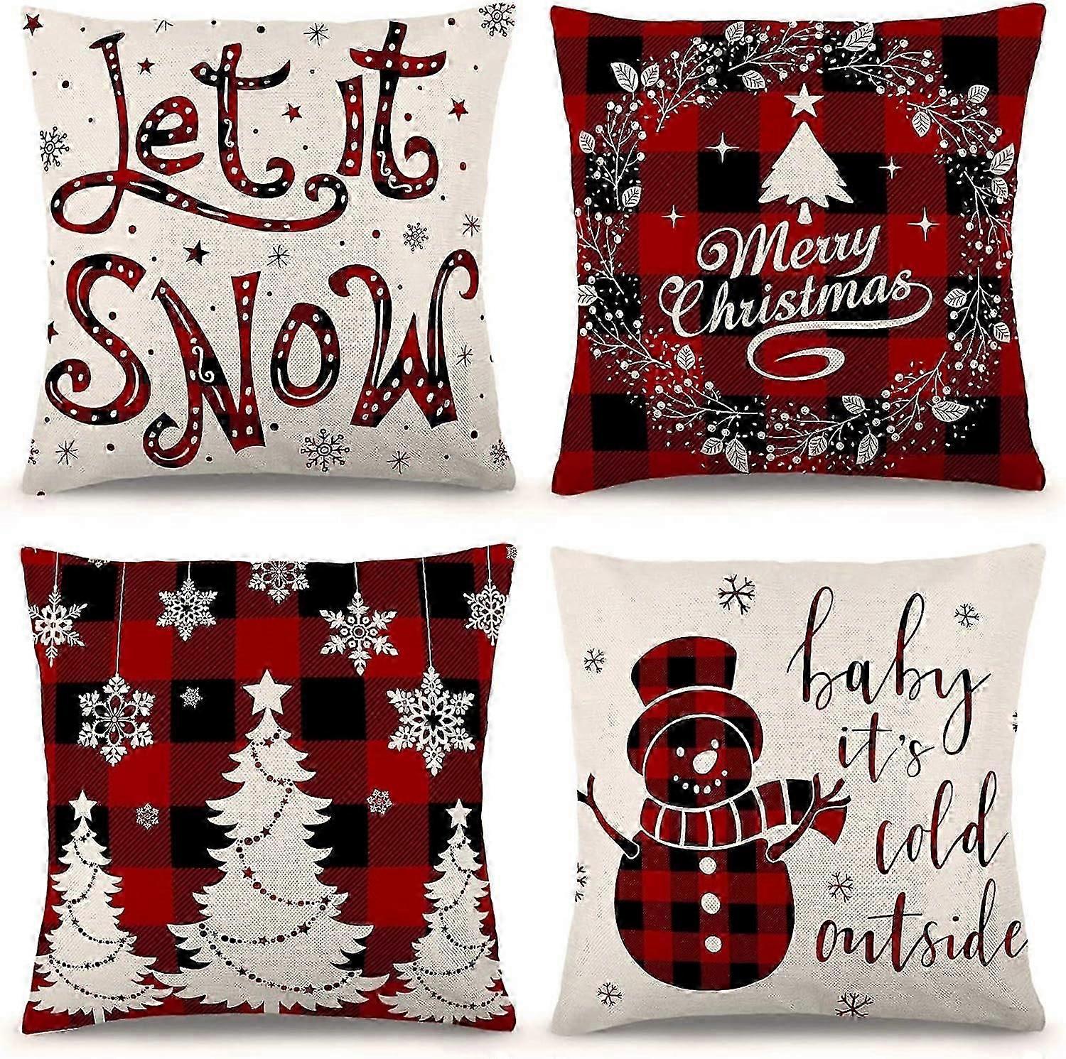 Linen Material Winter Holiday Decoration, Festive Designs Sofa Decor for Red Buffalo Plaid Snowman Reindeer Themes Set of 4 Farmhouse Black and Red