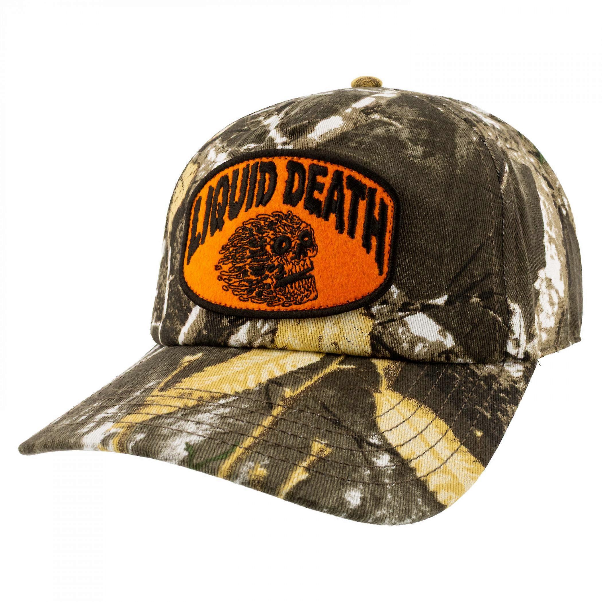 Officially licensed Liquid Death Logo on Camo Roscoe Hat. This polyester "Liquid Death" Roscoe-style hat features an all-over camo print and bold logo patch across the front with an adjustable snapback and rounded bill. All sizes are US sizes.