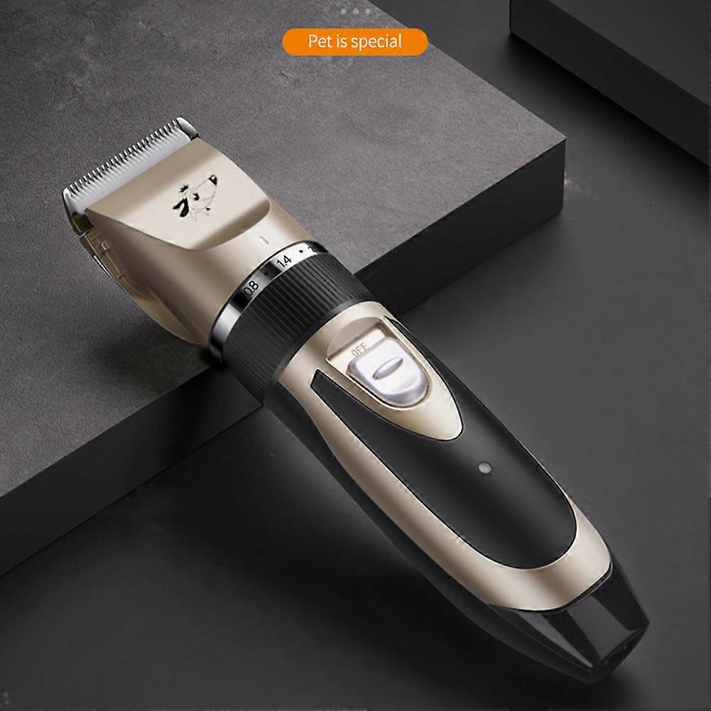 Specification:Color: GoldBody Size: About 18.5x4.5cm Cutter Material: Titanium CeramicMotor Working Voltage: 3.7V Standby Time: About 120 Minutes Battery Capacity: 1500mAh Charging Method: USB Charging Suitable for: All Pets Feature:1. Removable blades, easy to clean and clean.2. The ceramic knife is sharp and abrasion resistant, the titanium solid knife will not cause skin allergy.3. Five speed tuning + four comb limits: according to the length of your hair, trim the cutting head or set the limited comb. The length of the limited comb can be changed.4.Ultra-low Mute Design: This pet clipper with precision motor, low vibration for quiet operation and stress-free grooming Experience.5. The professional Pet Nail Clipper has a 1200mAh li-lion battery inside. For pets, the Clipper can be used continuously for about 2 hours. Package List:1x Trimmer4x Boundary Combs (3-6-9-12mm)1x Blade1x User Manual1x Cleaning Brush1x USB Cable