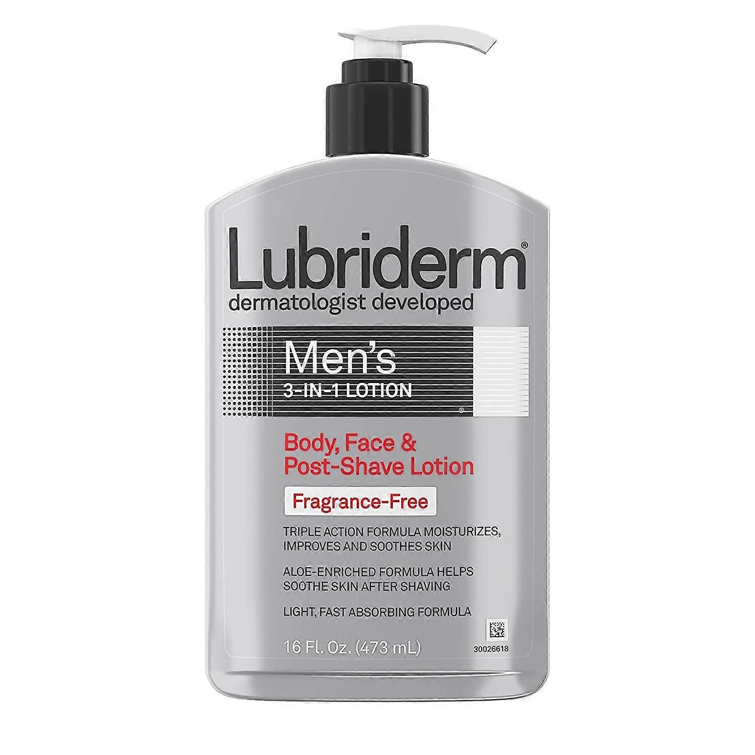 Body, face and post-shave lotion all in one Helps moisturize, soothe, and improve the healthy look of skin Specially formulated for men Aloe, minerals, and essential moisturizers Men's 3-in-1 Fragrance-Free Lotion will simplify your daily skin care routine, without fragrance. This aloe-enriched formula can be used as a body, face and soothing after-shave lotion. Lightweight, fast absorbing and non-greasy, in one convenient lotion meeting your skin care needs. The Importance of Daily Moisture The outermost layer of your skin forms your skin's moisture barrier. While the moisture barrier is critical to your skin's health, it can be easily impacted by environmental factors such as extended exposure to the elements, weather, and even your daily soap or cleanser. All of these can hurt your skin's ability to retain moisture and protect itself from dryness. Lubriderm has been clinically shown to improve skin's moisture barrier for visibly healthier skin. About Lubriderm Lubriderm believes everyone deserves to have healthy, comfortable skin. The brand developed by dermatologists, Lubriderm offers specialized formulations with essential nutrients naturally found in healthy skin. UPC: 052800480735 Weight: 1.38 lbs