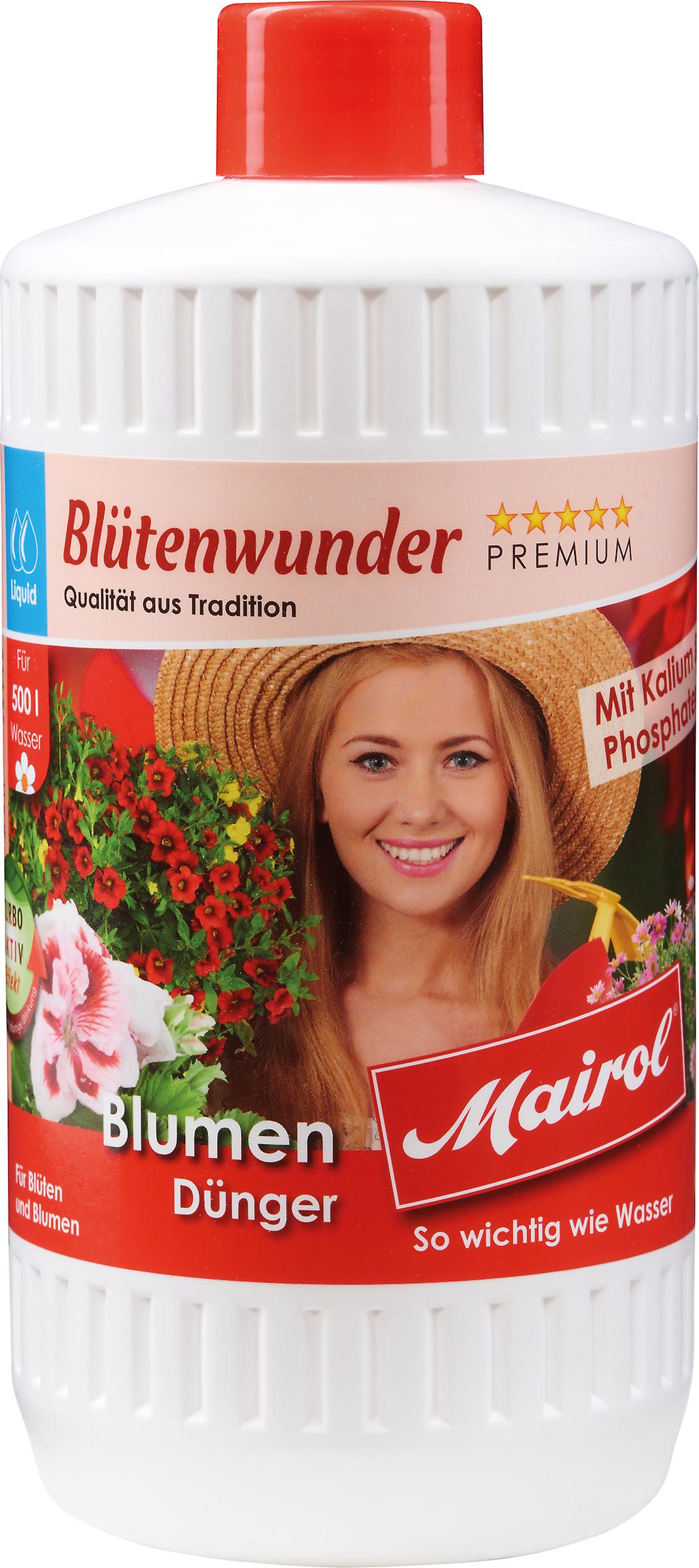Produktbeschreibung:Mairol Blütenwunder vitalisiert Blühpflanzen im Haus, auf Balkon und Terrasse sowie im Garten. Es stärkt die Blühwilligkeit, die Fruchtbildung und beschleunigt die Reife. Mit der speziellen Nährstoffzusammensetzung entwickeln die Pflanzen üppige und langanhaltende farbenfrohe Blüten.Mairol Blütenwunder ist ein Spezialdünger, der die Pflanzen kräftigt und für gesundes Wachstum sorgt.Anwendung:für: Eigenschaften: Mairol Turbo-Aktiv-Effekt: Ausgesuchte chelatisierte Spurenelemente stehen der Pflanze unmittelbar zur Verfügung.Hohe Ergiebigkeit: 1 Liter Blumen-Dünger reicht für 500 l GießwasserZur Blattdüngung geeignetHochwertig ausgesuchte RohstoffePhosphor und Kali betontGebrauchsanweisung: 2 ml Blumen-Dünger auf 1 Liter Gießwasser20 ml Blumen-Dünger auf 10 Liter GießwasserPflanzen erst ca. vier Wochen nach dem Pflanzen oder Umtopfen düngen.1 l reicht für 500 l GießwasserVor Gebrauch schütteln.Unser Expertentipp: Mairol Wachstumselixier in der Wachstumsphase der Pflanze und danach Wechsel auf Mairol Blütenwunder in der Blühphase.Anwendungszeitraum: März bis OktoberWirkstoffe / Inhaltsstoffe: NPK-Dünger 4 + 7 + 8 Packungsgröße: 1 Liter FlascheWichtige Informationen:Download "Sicherheitsdatenblatt" für dieses ProduktKennzeichnung gemäß Verordnung (EG) Nr. 1272/2008 [CLP/GHS] Sicherheitshinweise:P260 - Staub / Rauch / Gas / Nebel / Dampf / Aerosol nicht einatmen.P262 - Nicht in die Augen, auf die Haut oder auf die Kleidung gelangen lassen. Anwendung durch nichtberufliche Anwender zulässig.Diese Produktinformationen ersetzen nicht die Beachtung der Gebrauchsanweisung und erheben keinen Anspruch auf Vollständigkeit.Produkt vorsichtig verwenden. Vor Verwendung stets Etikett und Produktinformationen lesen.