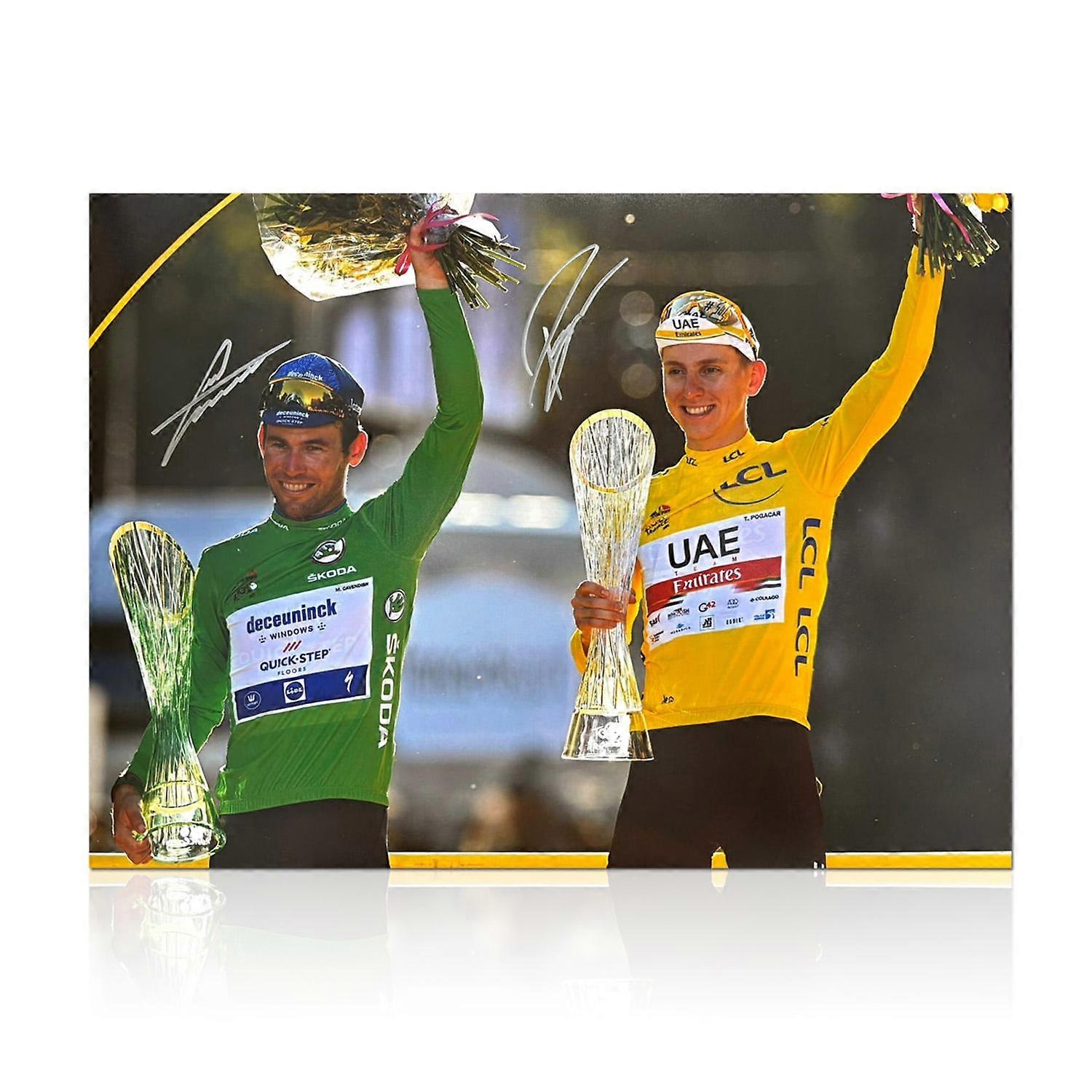 16 x 12 inches photograph signed by Mark Cavendish and Tadej Pogačar. / This photo was signed by Mark Cavendish on October 8th, 2025 in London and Tadej Pogačar on October 18th 2025 in Andorra. The photo shows Cavendish and Pogacar on the podium at the end of the 2021 Tour de France. Pogacar won the general classification after winning stages 5, 17 & 18, finishing almost five and a half minutes ahead of second place Jonas Vingegaard. Cavendish took the green jersey after winning his first Tour stage since 2016 on stage 4. Cav proceeded to win three more stages to equal Eddy Merckx's record for the most career Tour stage wins. All signatures are originals they are never printed. The product image is a stock photo so the position of signatures might vary slightly. Exclusive Memorabilia unconditionally guarantees all signed items are genuine. The item will come with a certificate of authenticity featuring a numbered hologram that matches an identical hologram affixed to the product. Exclusive Memorabilia is the UK's most trusted brand of sports and entertainment memorabilia, supplying Premiership football clubs, leading cruise lines and charities with their memorabilia for sale and auction.