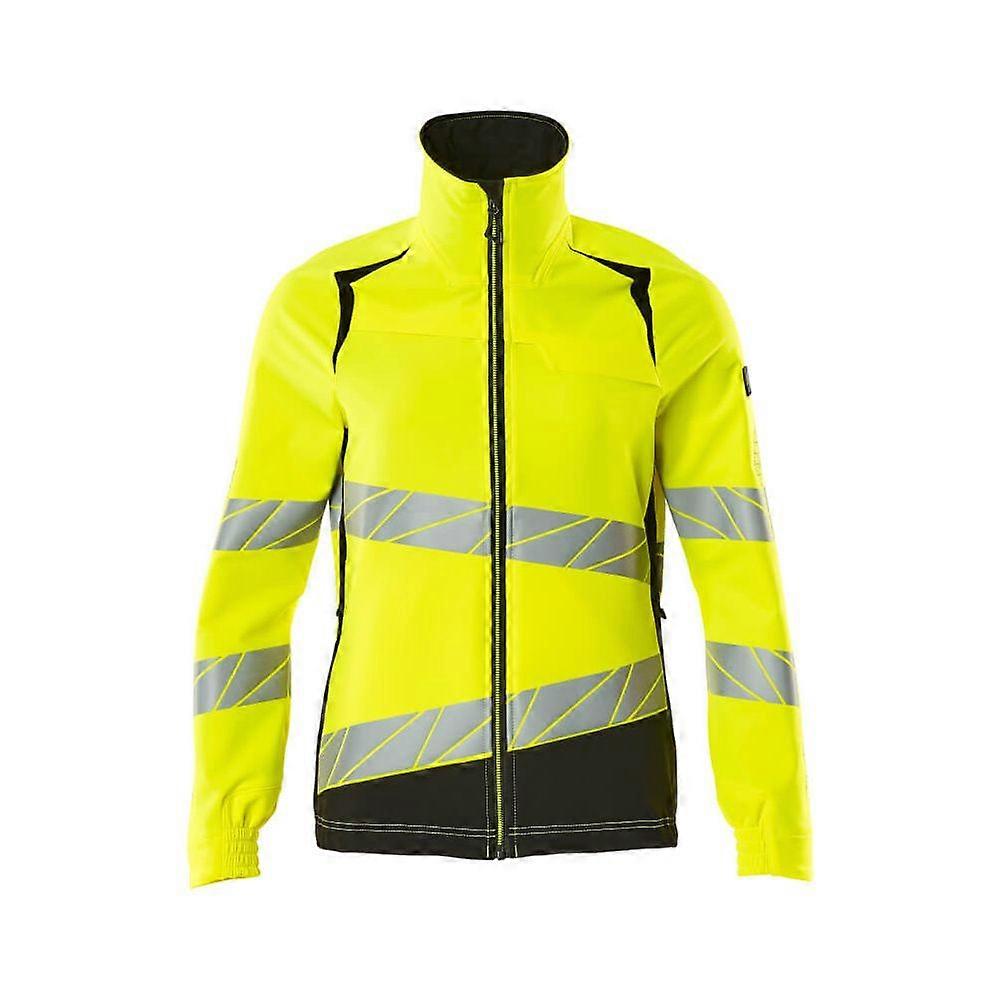 Introducing the Mascot Hi-Vis Water Repellent Stretch Jacket 19008-511 - Womens, Accelerate Safe, a garment meticulously designed to cater to the dynamic needs of women in the workforce. This jacket combines functionality with style, featuring a ladies fit that is both flattering and comfortable. Crafted from ULTIMATE STRETCH fabric, it is lightweight yet durable, ensuring ease of movement and a long-lasting wear. The two-toned design is enhanced with fluorescent colors and oblique, transverse reflective strips, significantly boosting visibility for safety. Additionally, it boasts a high collar, a water-repellent finish, and is prepared for the attachment of an ID card, making it a versatile choice for various work environments.