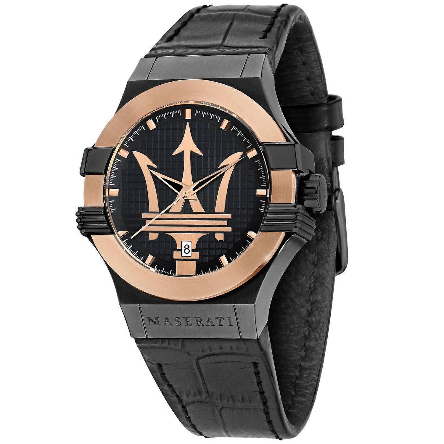 Maserati's Potenza, a best-seller, features a rose gold case, a black leather strap and a skeleton dial highlighting intricate automatic movement. The Potenza collection has a modern, clean design incorporating Maserati's iconic Trident logo and dynamic bezel. Movement: QuartzPower Reserve: 41 Hour Case Size : 42 mmCase Material: Stainless Steel - Case Shape : RoundDial Type: Analog - Dial Color: Black SkeletonCrystal: Scratch Resistant MineralBand Type: Strap - Band Material: Silicone Black 10 atm (bath/swimming)