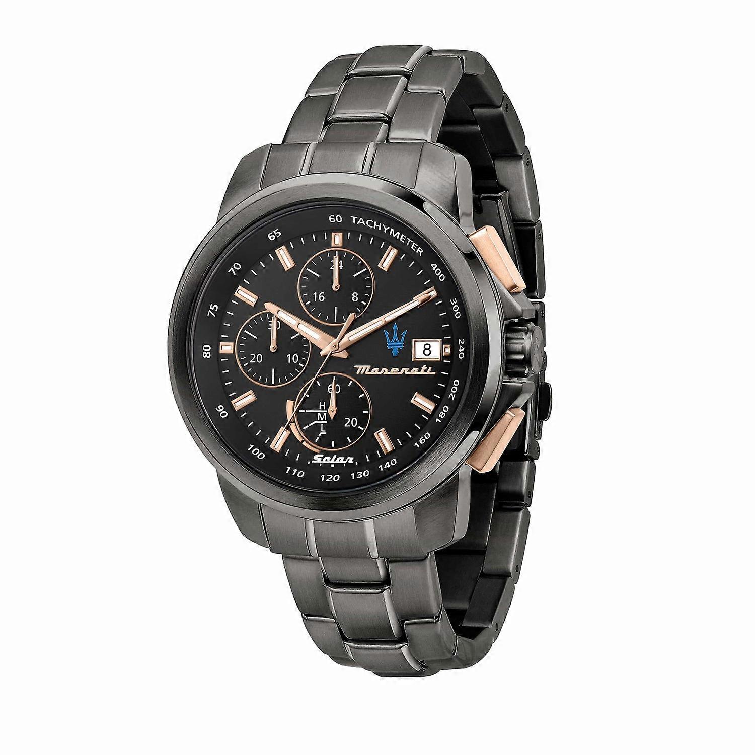 Presenting the Maserati Successo Solar 44mm Gun Metal Chronograph Watch.Cutting-edge technical solutions are behind the watches from Maserati Successo Solar collection, creating technical masterpieces such as this Maserati Successo Solar Gunmetal Chronograph Watch. Watches powered by solar cells that capture natural and artificial light and transform it into energy for the movement (chrono and 3H). Their autonomy, when fully wound, is approximately four months. A sporty look with a 45mm case for the men's version, which features dials with luminescent indexes and hands, contrasting finishes and a power reserve indicator.45mm Case Diameter11mm Case ThicknessChronograph FunctionStainless Steel Gunmetal PVD BandSolar Powered Movement4 Month Power Reserve10 ATM Water ResistantMineral Crystal Glass