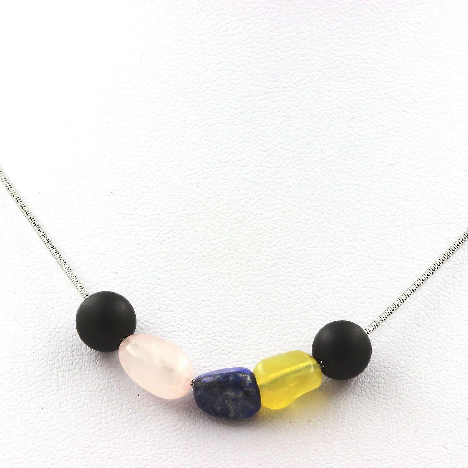 Matte black Onyx beaded necklace 8 mm + Rose Quartz from Brazil + Lapis Lazuli from Pakistan + Yellow Opal from Australia