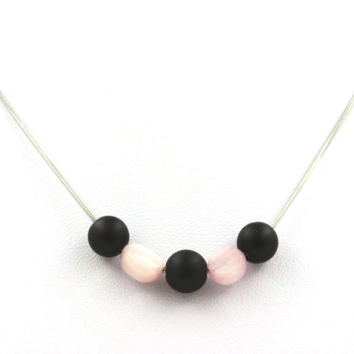 Matte black Onyx pearl necklace 8 mm + Kunzite from Brazil
