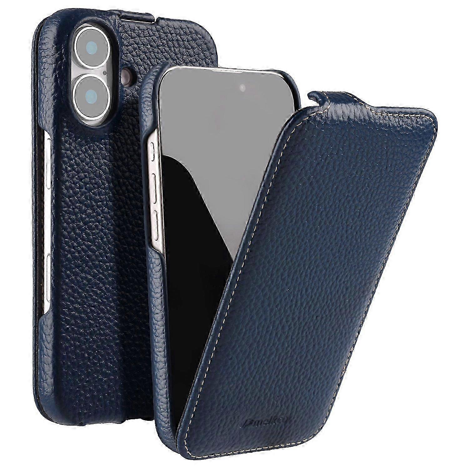 MELKCO For iPhone 16 Magnetic Case Vertical Flip Genuine Cow Leather+PC Shockproof Cover - Blue
