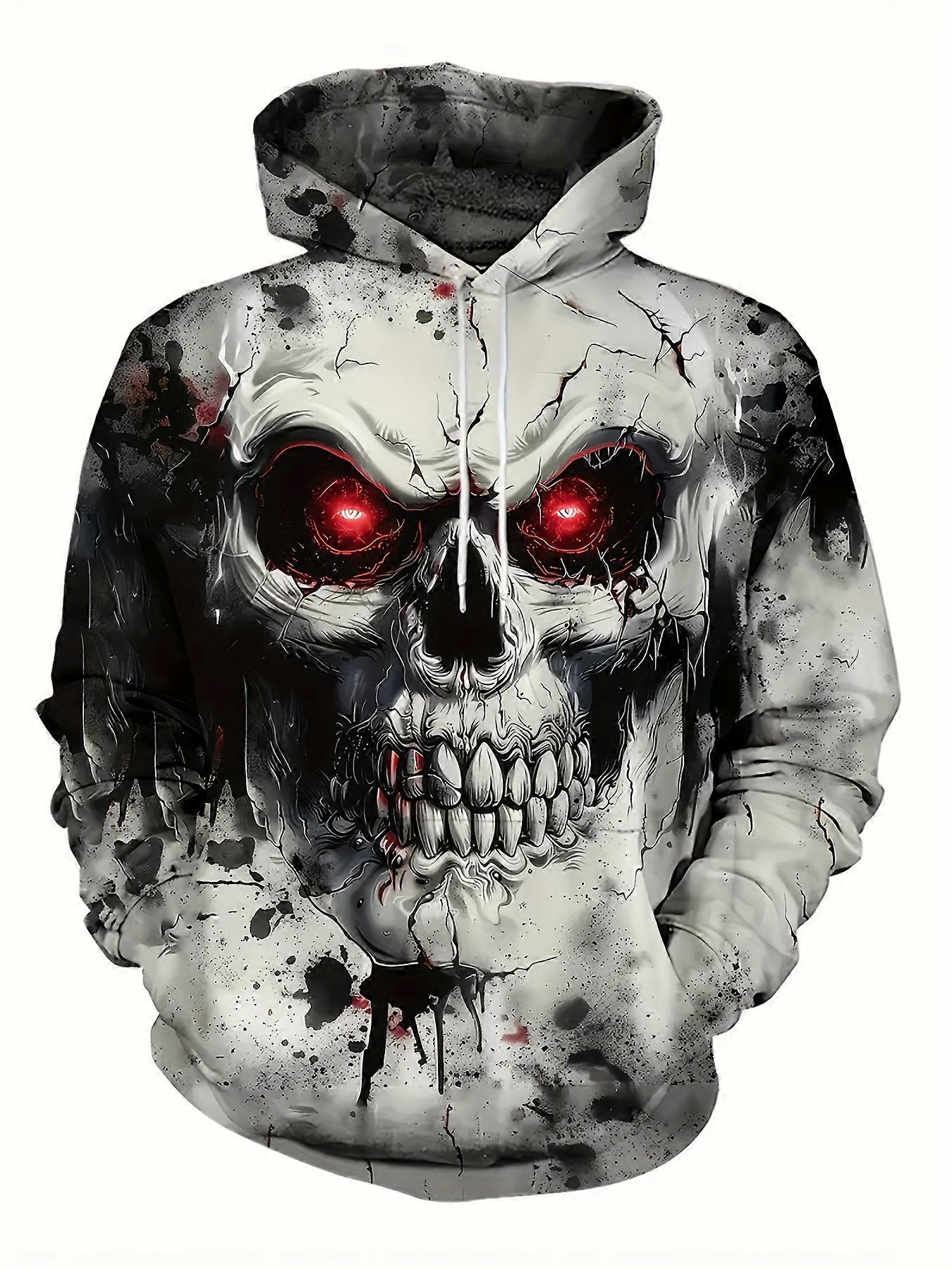 Men’s Edgy Graphic Hoodie Red Eye Cracked Skull Print Casual Streetwear Pullover