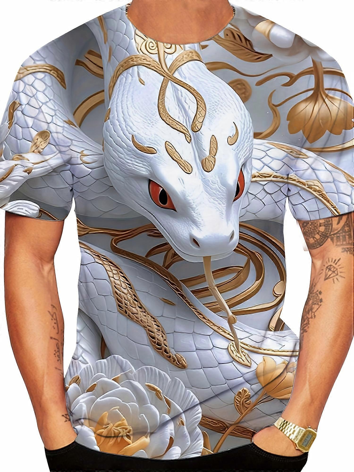 Men’s Elegant Graphic 3D Print T Shirt White Snake Gold Accent Print Casual Streetwear Tee