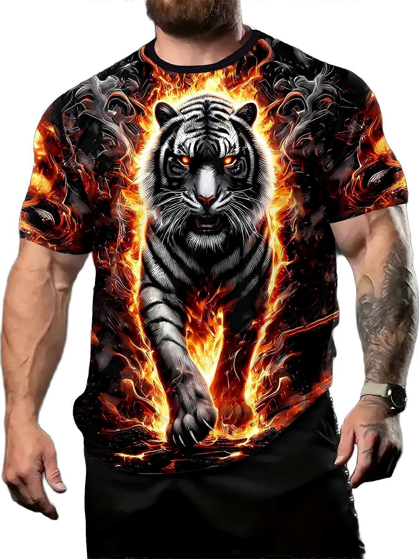 Men’s Fiery 3D Graphic T Shirt White Tiger Flame Scene Print Casual Streetwear Tee