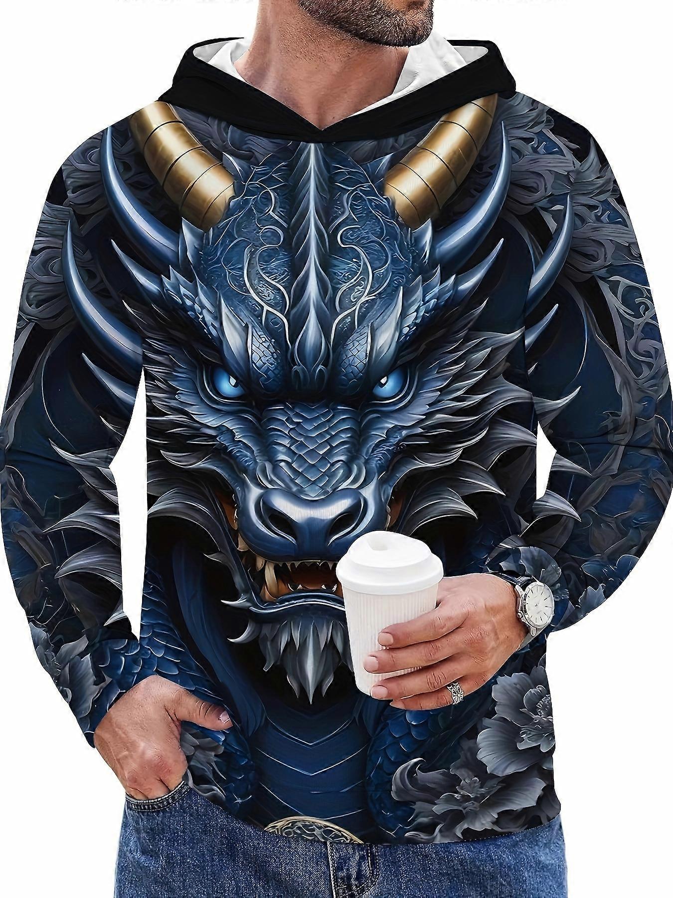 Men’s Hoodie Blue Dragon Graphic Print Casual Streetwear Pullover