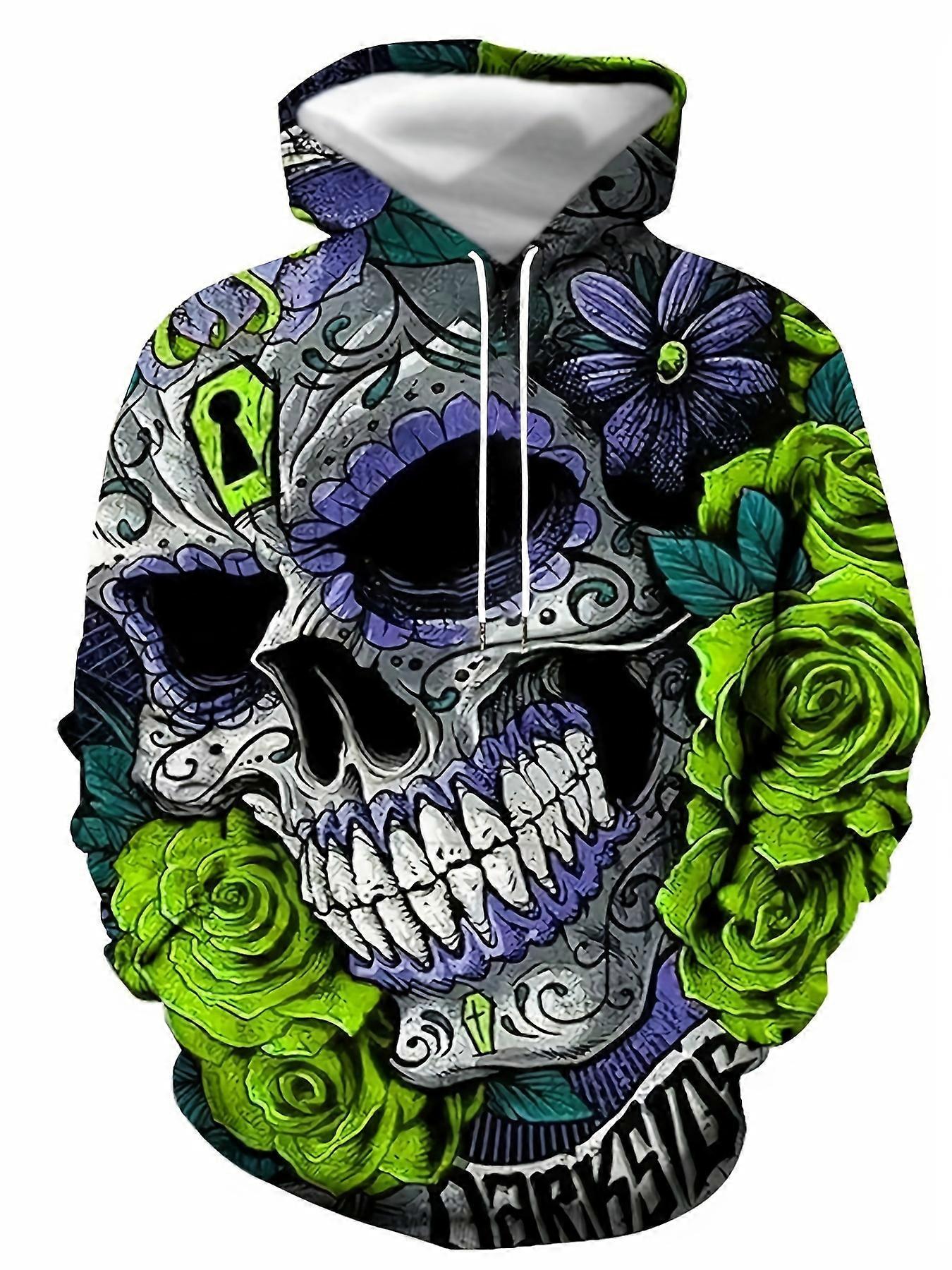 Men’s Vibrant Graphic Hoodie Floral Skull Print Casual Streetwear Pullover