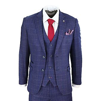 Mens 3 Piece Blue Herringbone Check Vintage Classic Suit