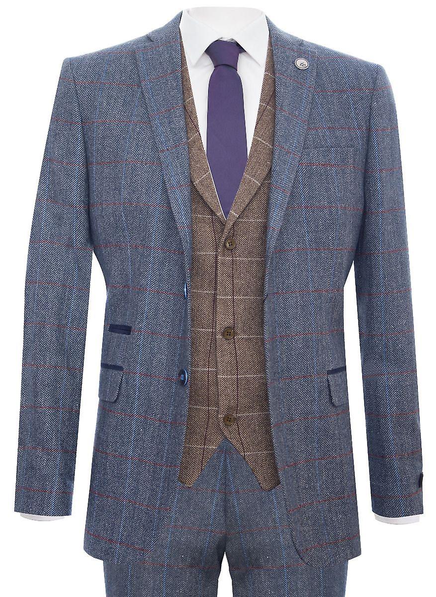 Mens 3 Piece Tweed Check Blue Suit 1920s Oak Brown Waistcoat