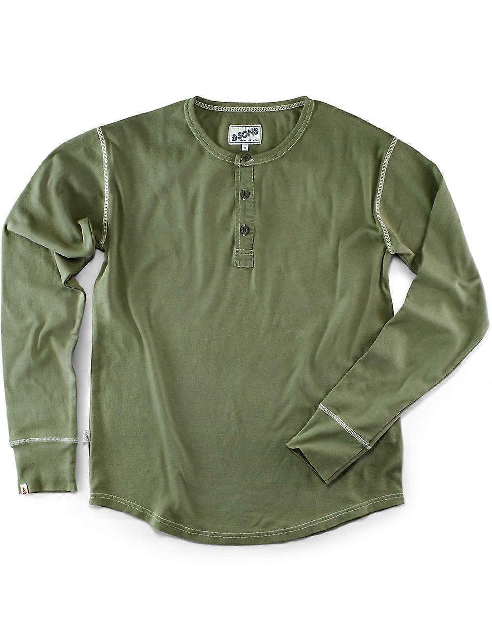 The &SONS New Elder Henley Shirt is a timeless essential inspired by classic workwear and early athletic gear. Crafted from 100% organic cotton, it’s soft, breathable, and built for everyday comfort with a subtle vintage edge. The regular fit keeps it easy to layer, while the three-button Henley neckline adds a touch of rugged charm. Ribbed cuffs ensure a secure, comfortable fit, and the subtle &SONS branding tab on the sleeve adds the perfect finishing detail. Whether worn on its own or under a jacket, this piece is a true staple — simple, versatile, and made to last. Founded in the UK, &SONS celebrates craftsmanship and vintage-inspired design, reimagining timeless workwear for the modern maker. With durable fabrics and authentic detailing, their pieces pay homage to classic tradesman style. Be sure to check out the story behind heritage workwear in our Heritage Workwear Guide.And Sons The New Elder Henley Shirt Green Made from 100% organic cotton for softness and durability Regular fit ideal for layering or standalone wear Classic Henley neckline with three-button opening Ribbed cuffs for a comfortable, secure fit Finished with a subtle &SONS branding tab on the sleeve 31422043002 Description By: APM