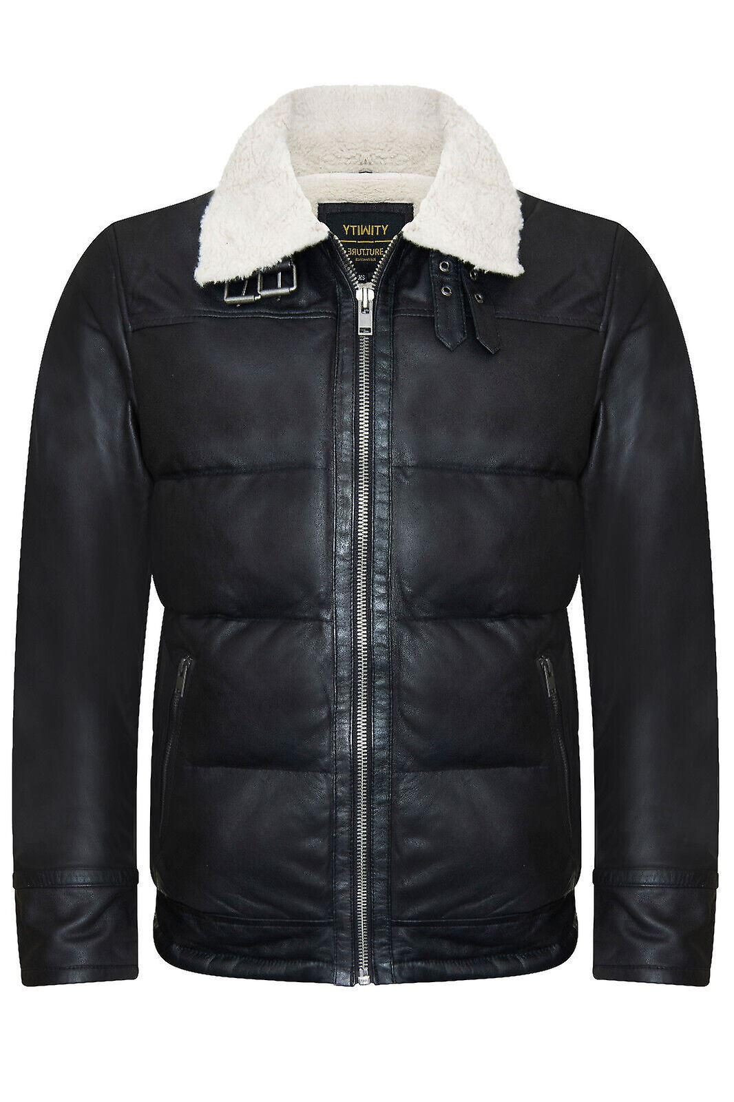 Men's Black Aviator Leather Jacket Quilted Bomber Warm Biker Puffer Jacket