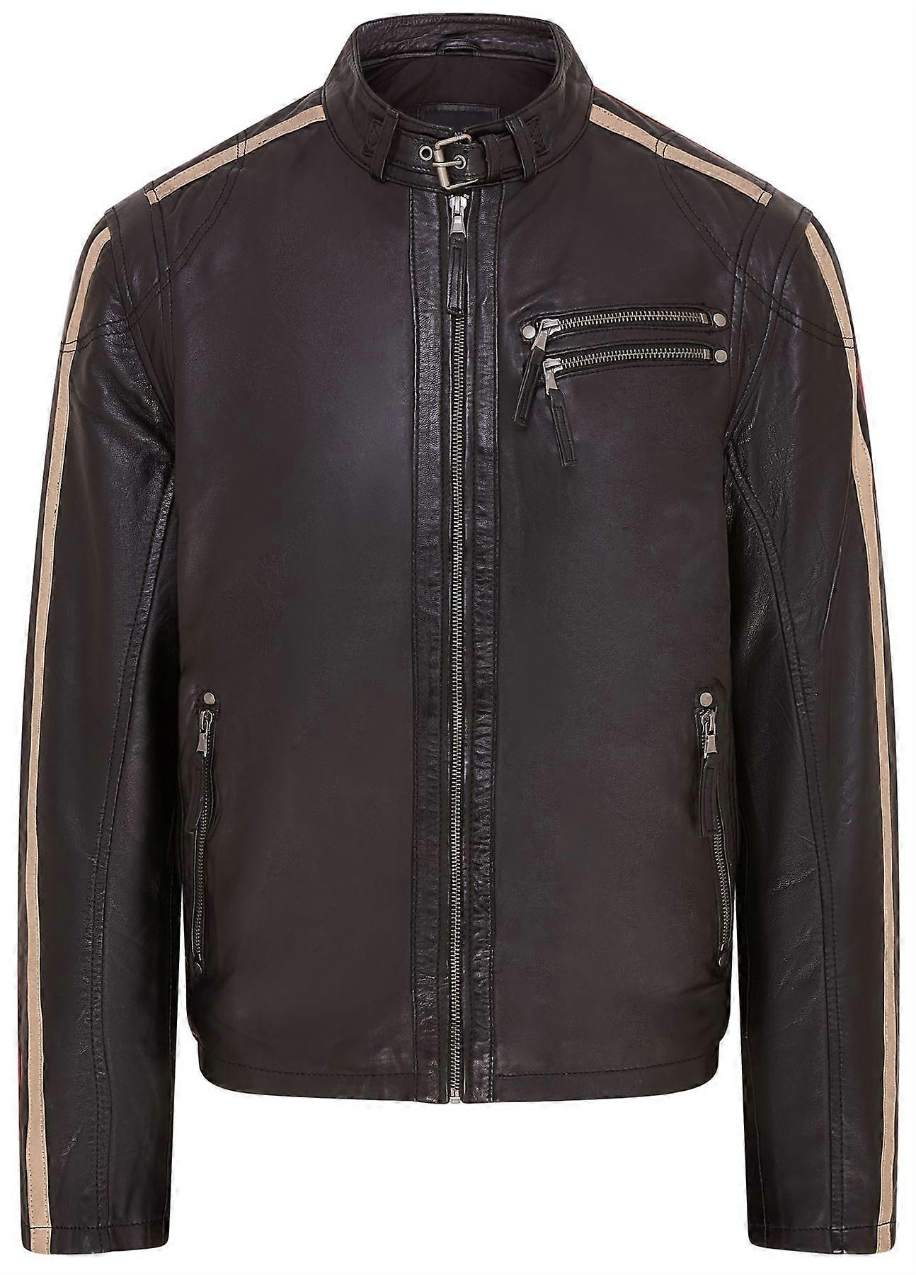 Mens Black Cafe Racer Striped Leather Jacket Vintage Biker Motorcycle Jacket