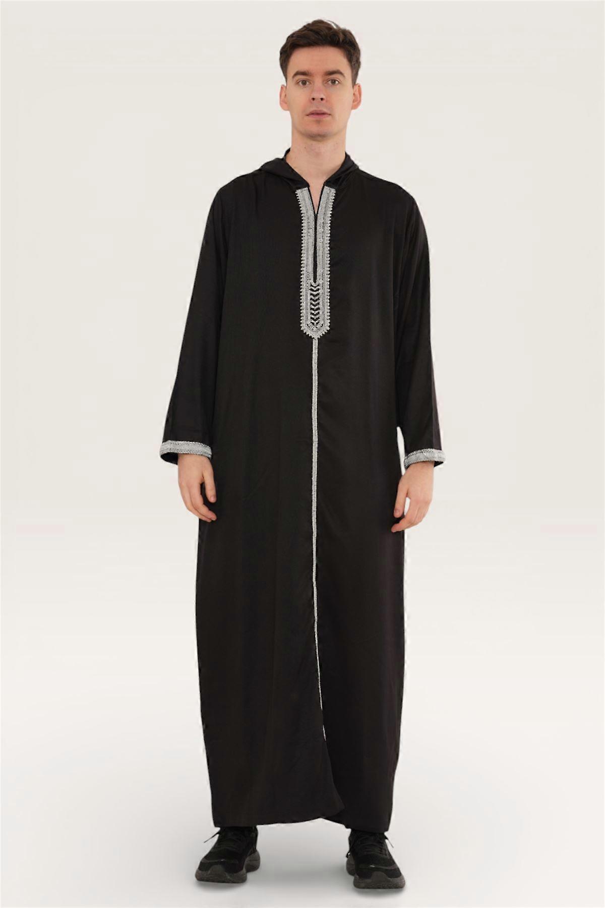 Men's Black Hooded Moroccan Silver Embroidery Djellaba Islamic Jubba Robe Eid Ramadan Thobe