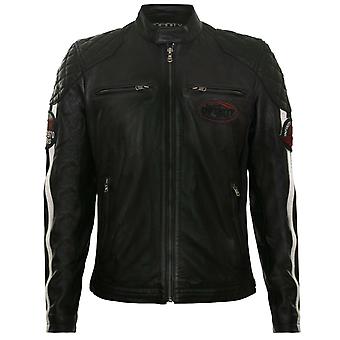 Men's Black Leather Striped Badged Biker Jacket