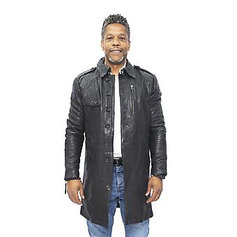 Men's Black Soft Long Military Trench Distressed Leather Coat