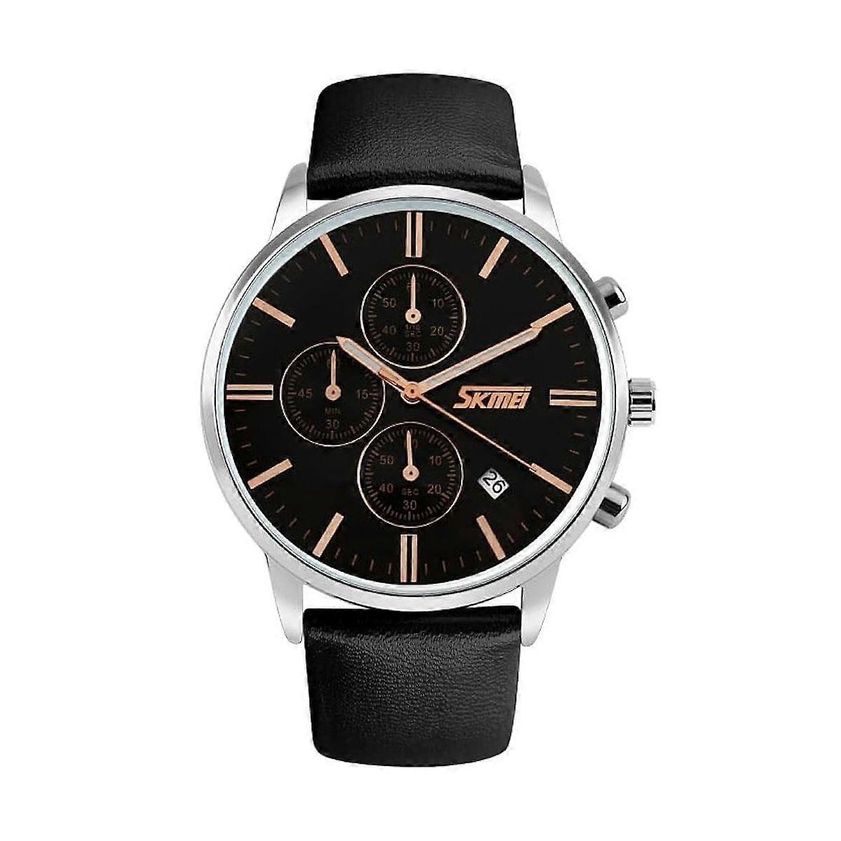 Mens Black Watch Silver and Rose Gold with Leather Strap and Date UK Stock