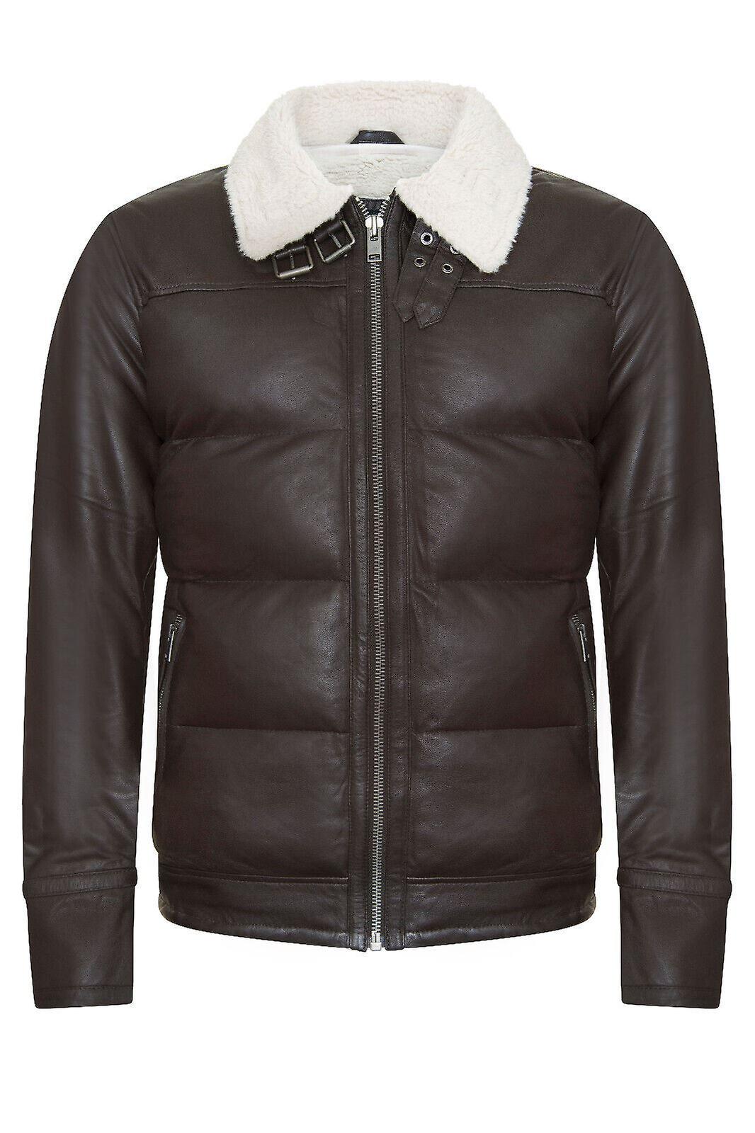 Men's Brown Aviator Leather Jacket Quilted Bomber Warm Biker Puffer Jacket