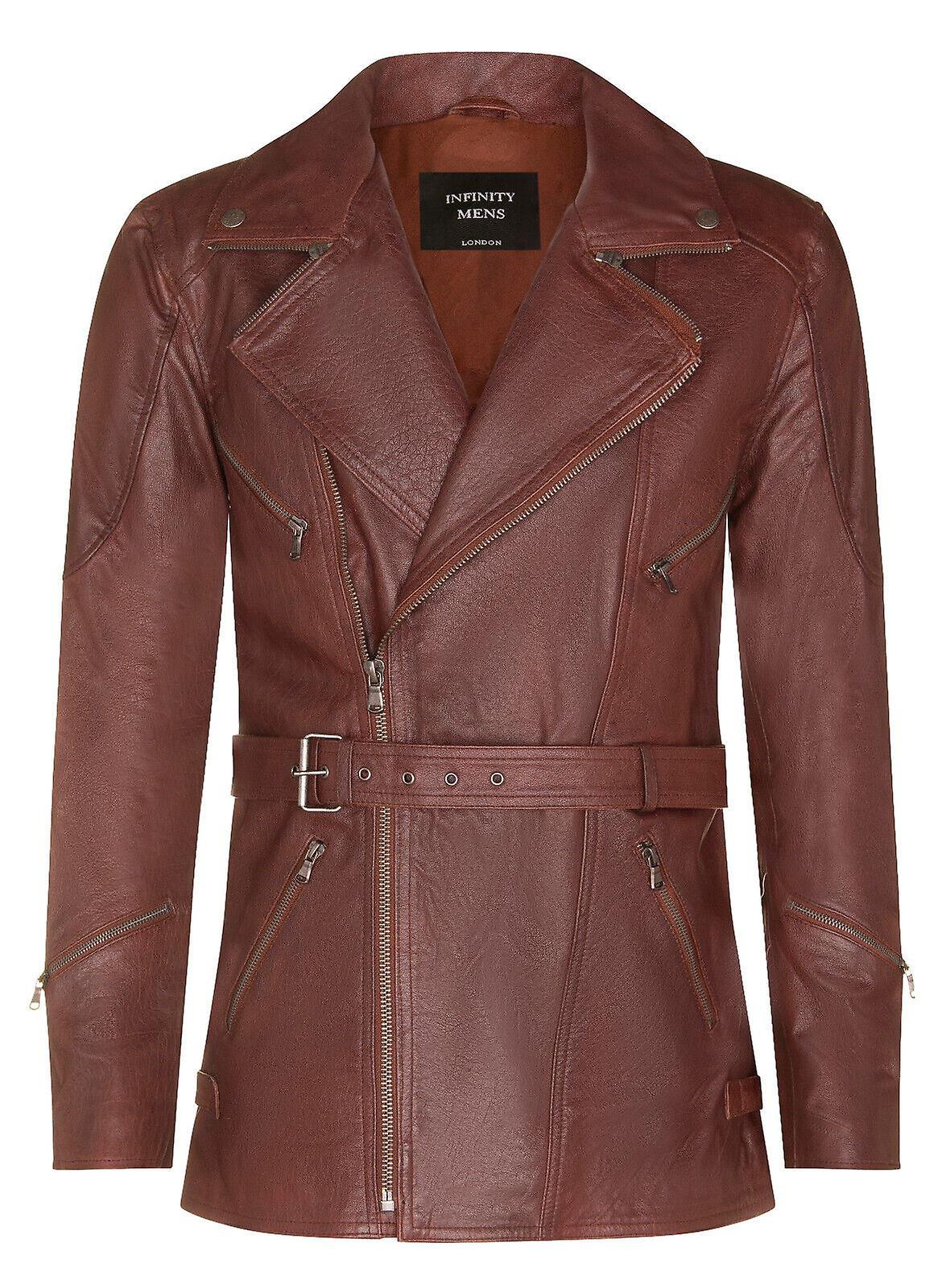 Mens Cross Zip 3/4 Brown Jacket Long Motorcycle CE Armour Biker Jacket