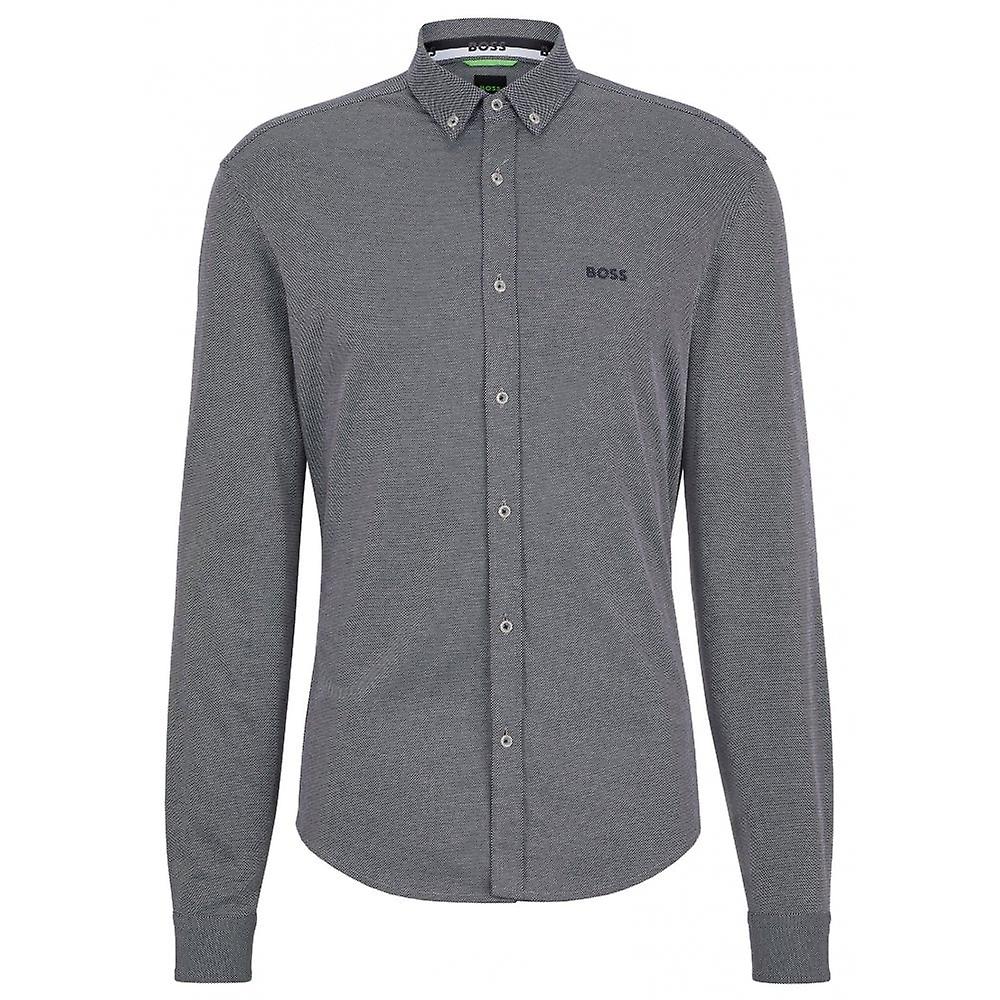 Hugo Boss navy/grey Biado black long sleeved shirt. Soft cotton in a stretch fabric. This shirt is tailored to a regular fit with BOSS logo to chest, button down collar and long sleeves with button cuffs. Made from 100% cotton for a comfortable fit.Regular fit Soft cotton Stretch fabric boss logo to chest Angle cuffs Button down collar
