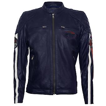 Men's Navy Leather Striped Badged Biker Jacket