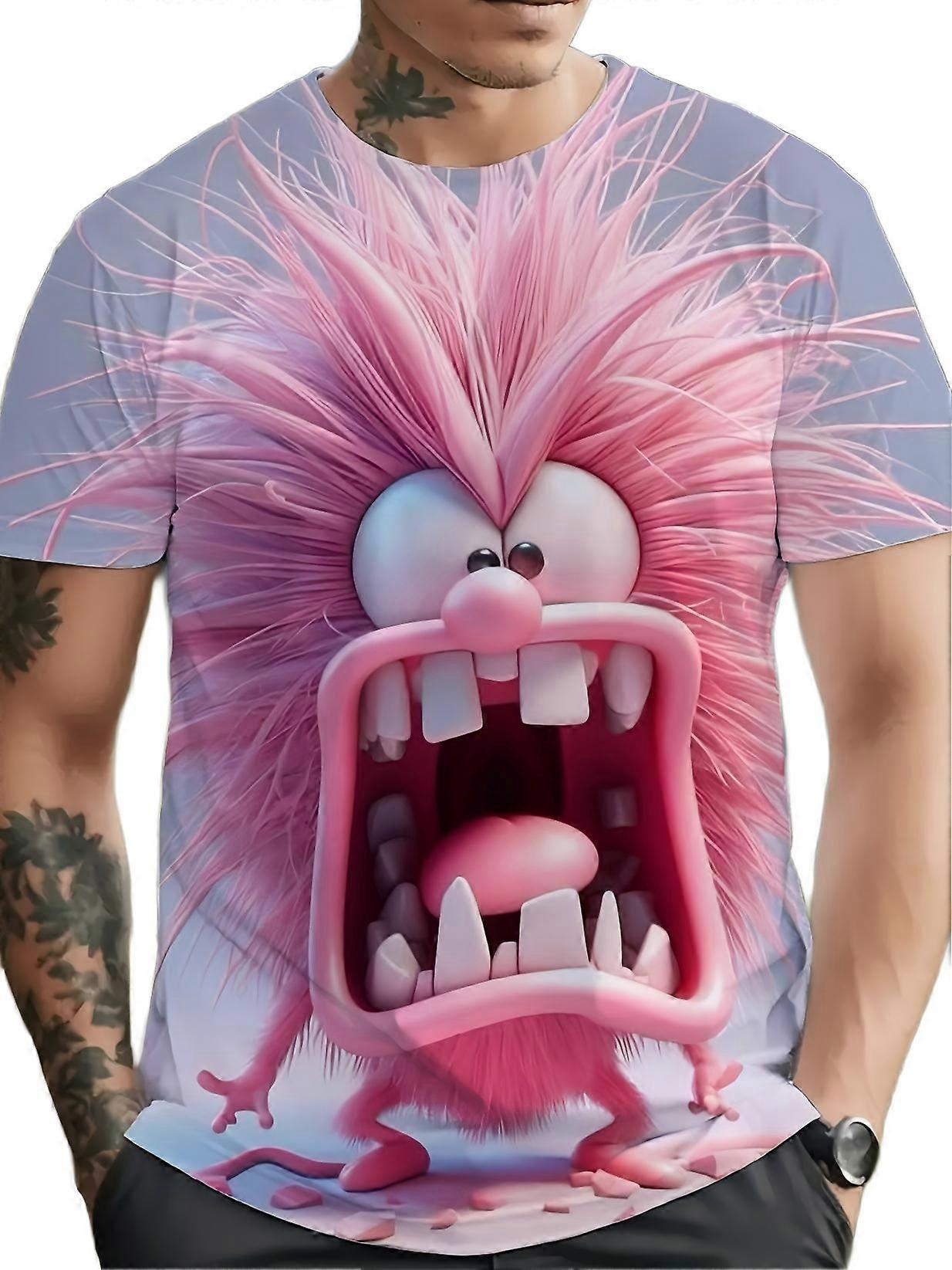 Men's Pink Furry Creature Graphic T-Shirt Playful Art Print Tee Fun Casual Top