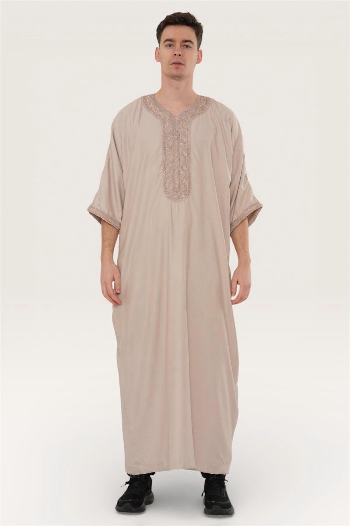 Men's Salmon Moroccan Thobe Djellaba Arab Short Sleeve Embroidery Gandoura Robe Jubba