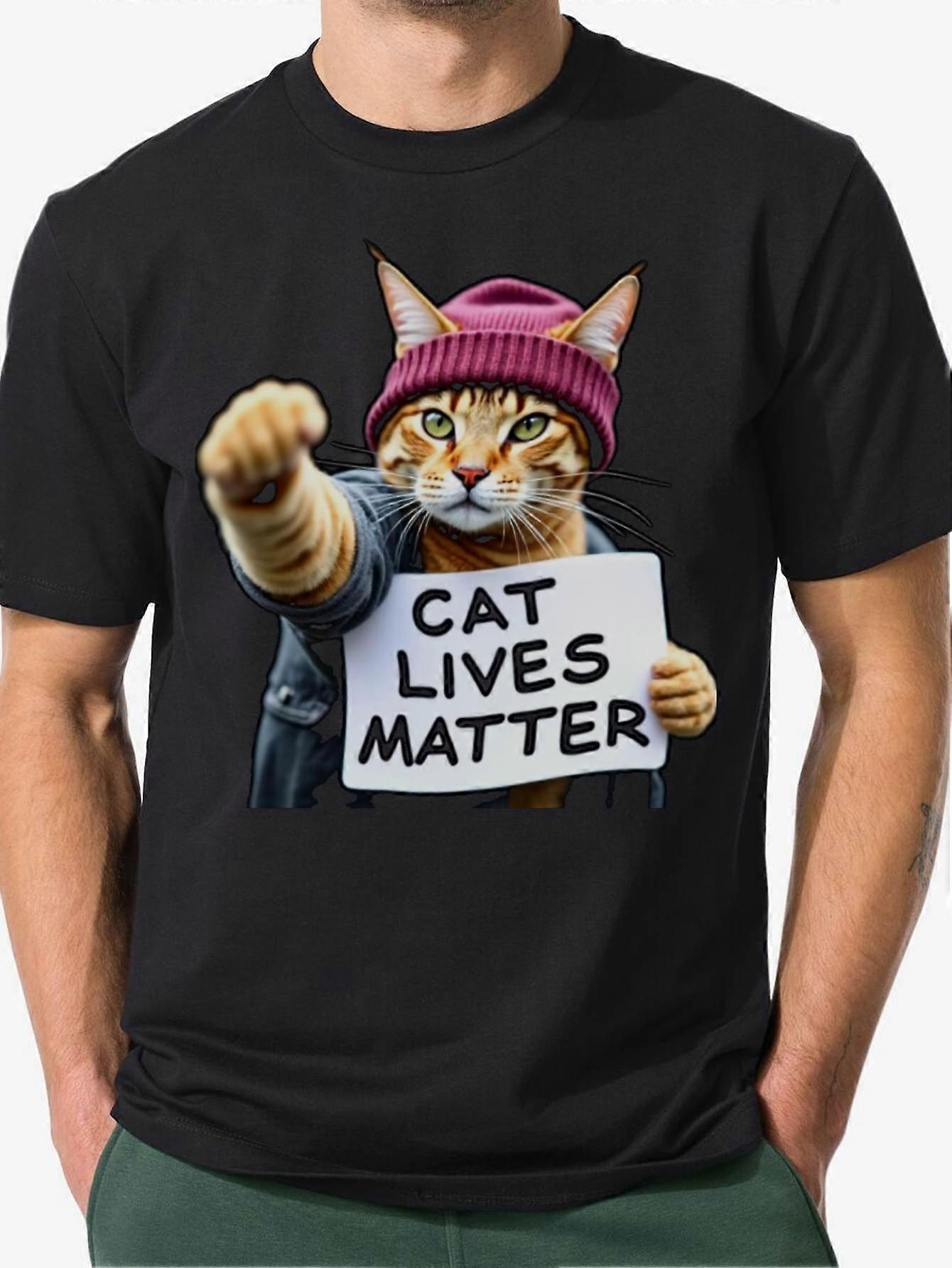 Men's Vintage Cat & "Cat Lives Matter" Graphic T-Shirt - Distressed Print Crew Neck Short Sleeve