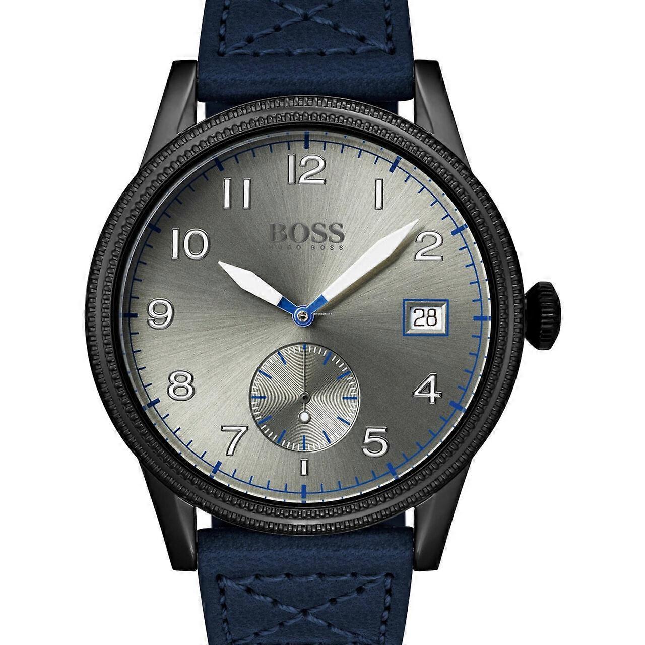Model: Mens Watch Hugo Boss 1513684, Quartz, 44mm, 5ATM. Brand: Hugo Boss. Package Weight: 0.5 Kg. Movement: Quartz. Case Color: Silver. Watchband Color: Blue. Watchband Material: Leather. Case width: 44 mm.