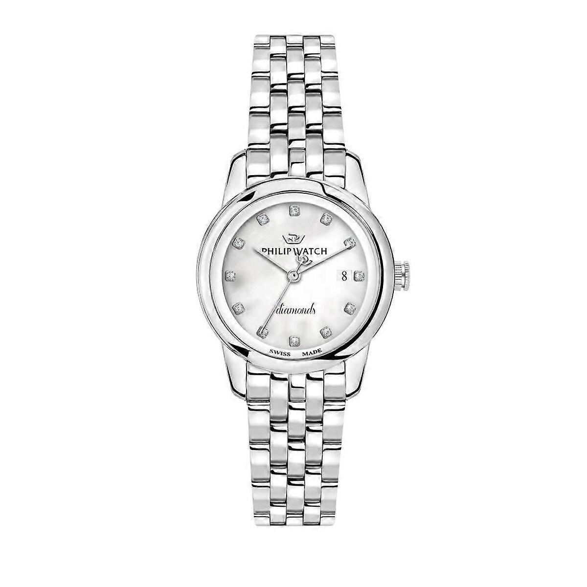 If you like keeping up with the latest fashion and accessory trends, buy Men's Watch Philip Watch R8253150505 White Silver at the best price. The men's watch Philip Watch R8253150505 combines timeless elegance and functional precision in a carefully crafted design for those who value quality and refined style. This model stands out for its stainless steel case and bracelet with a silver finish, offering not only durability and everyday resistance but also a sophisticated look suitable for both formal and casual settings. The white dial provides sharp, easy-to-read contrast, enhanced by minimalist details that allow for quick time reading in any situation. Among its features is the practical date display, discreetly integrated into the dial to help keep track of the days without disrupting the watch’s harmonious design. While classified as a men's watch, its unisex design also makes it perfectly suitable for women seeking a medium-sized watch with a classic aesthetic. Manufactured in 2019, it reflects Philip Watch’s watchmaking tradition, where attention to detail and the selection of high-quality materials ensure a lasting and reliable experience. This watch is a balanced choice for those looking for a functional, robust accessory with a touch of timeless distinction. Gender: MenLadyExtra links: NoType of watch: WristwatchMaterial: SilverFunctions: DateWater resistance: 10 atmCrystal: MineralType of movement: QuartzColour: WhiteSilverYear: 2019Bracelet material: Stainless steelDesign: LadyBattery operated: AA x 1, includedType of guarantee: From the manufacturerApprox. diameter: 36 mm