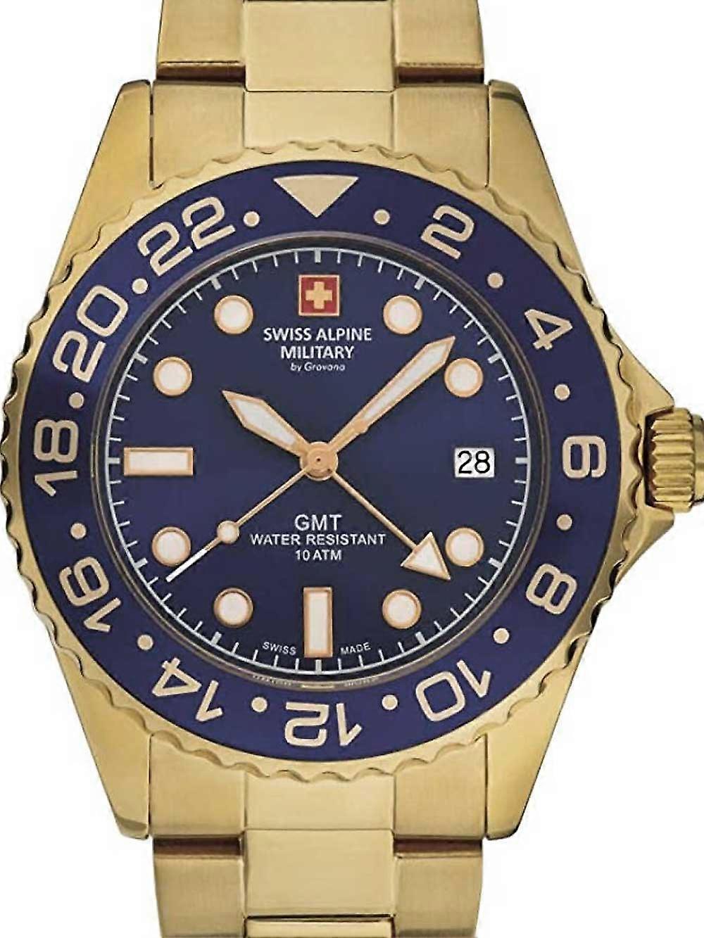 Model: Mens Watch Swiss Alpine Military 7052.1115, Quartz, 42mm, 10ATM. Brand: Swiss Alpine Military. Package Weight: 0.5 kg. Movement: Quartz. Case Color: Blue. Watchband Color: Gold. Watchband Material: Steel. Case width: 42 mm.