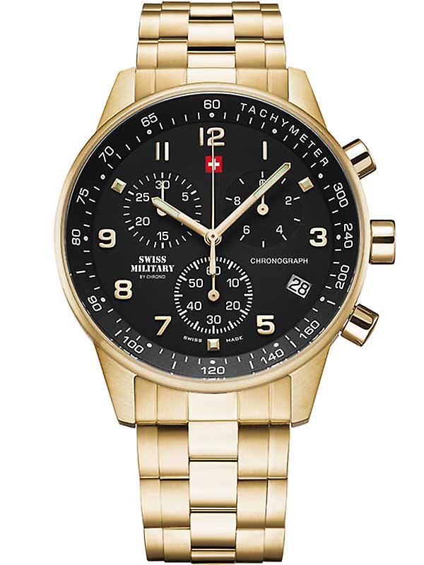 Model: Mens Watch Swiss Military By Chrono SM34012.12, Quartz, 41mm, 5ATM. Brand: Swiss Military By Chrono. Package Weight: 0.5 Kg. Movement: Quartz. Case Color: White. Watchband Color: Gold. Watchband Material: Steel. Case width: 41 mm.