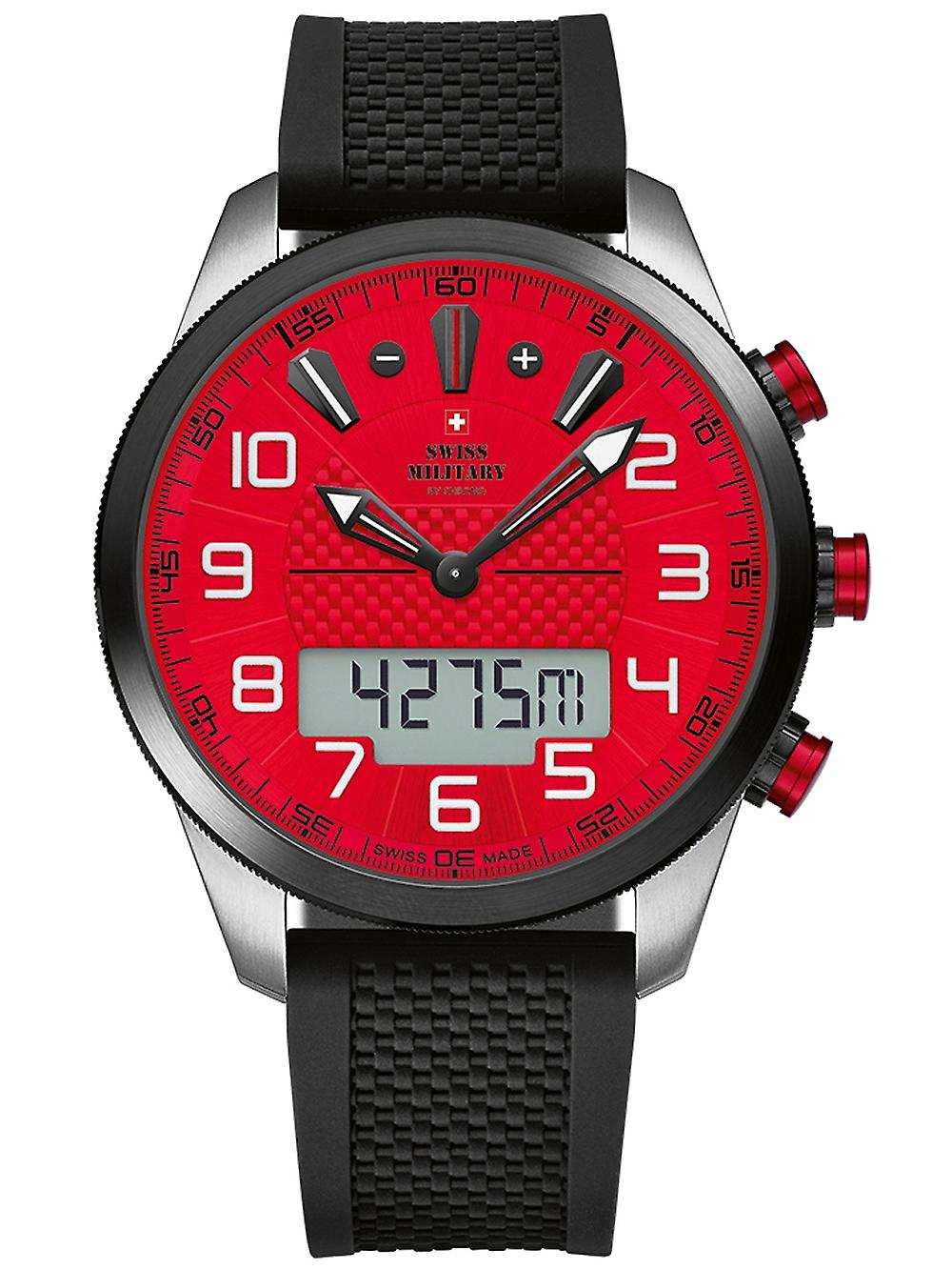 Model: Mens Watch Swiss Military By Chrono SM34061.02, Quartz, 45mm, 10ATM. Brand: Swiss Military By Chrono. Package Weight: 0.5 Kg. Movement: Quartz. Case Color: Red. Watchband Color: Black. Watchband Material: Silicone. Case width: 45 mm.