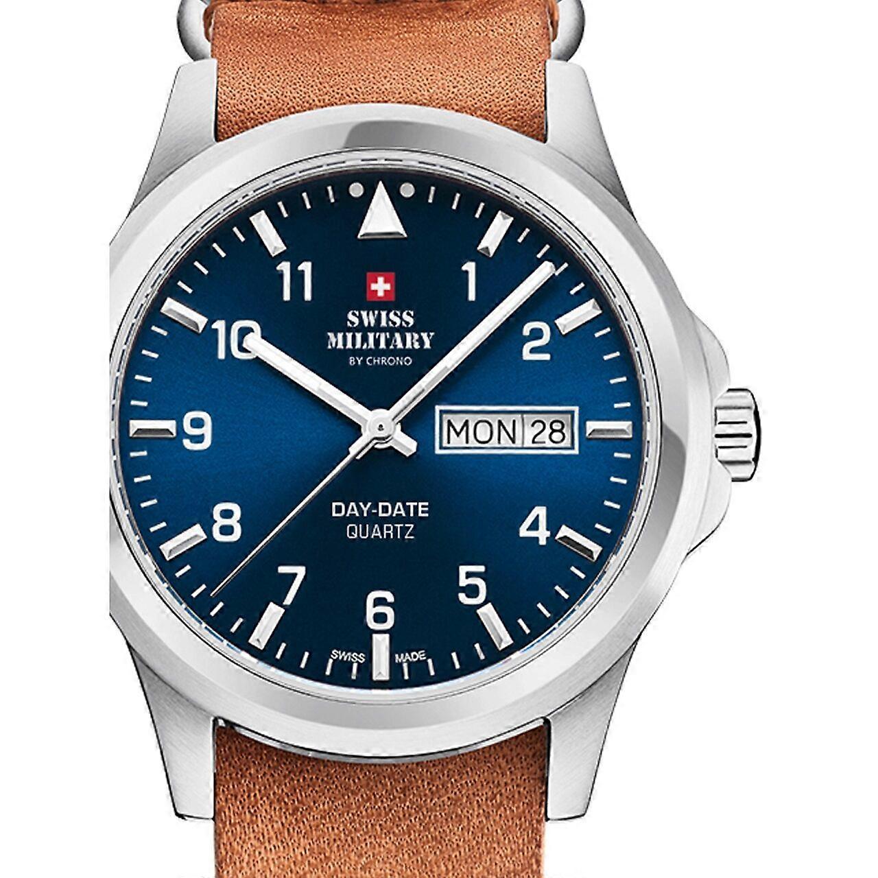 Model: Mens Watch Swiss Military By Chrono SM34071.05, Quartz, 40mm, 5ATM. Brand: Swiss Military By Chrono. Package Weight: 0.5 Kg. Movement: Quartz. Case Color: Blue. Watchband Color: Brown. Watchband Material: Leather. Case width: 40 mm.