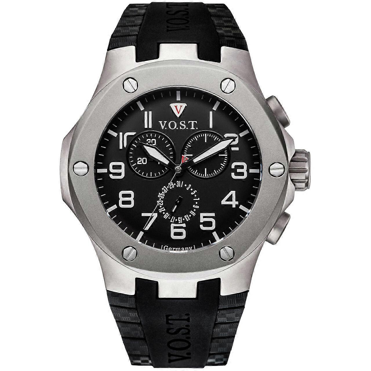 Model: Mens Watch V.O.S.T Germany V100.024.CT.TT.R.B, Quartz, 44mm, 20ATM. Brand: V.O.S.T Germany. Package Weight: 0.5 Kg. Movement: Quartz. Case Color: Black. Watchband Color: Black. Watchband Material: Silicone. Case width: 44 mm.