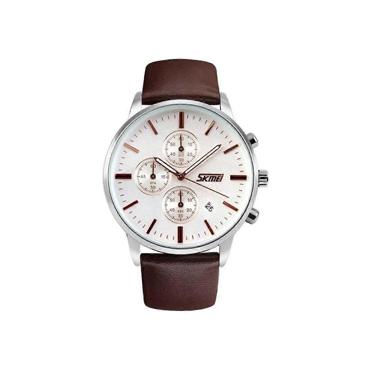 Mens Watch White Dial Silver Bezel Rose Gold Hands with Brown Leather Strap Date UK Stock