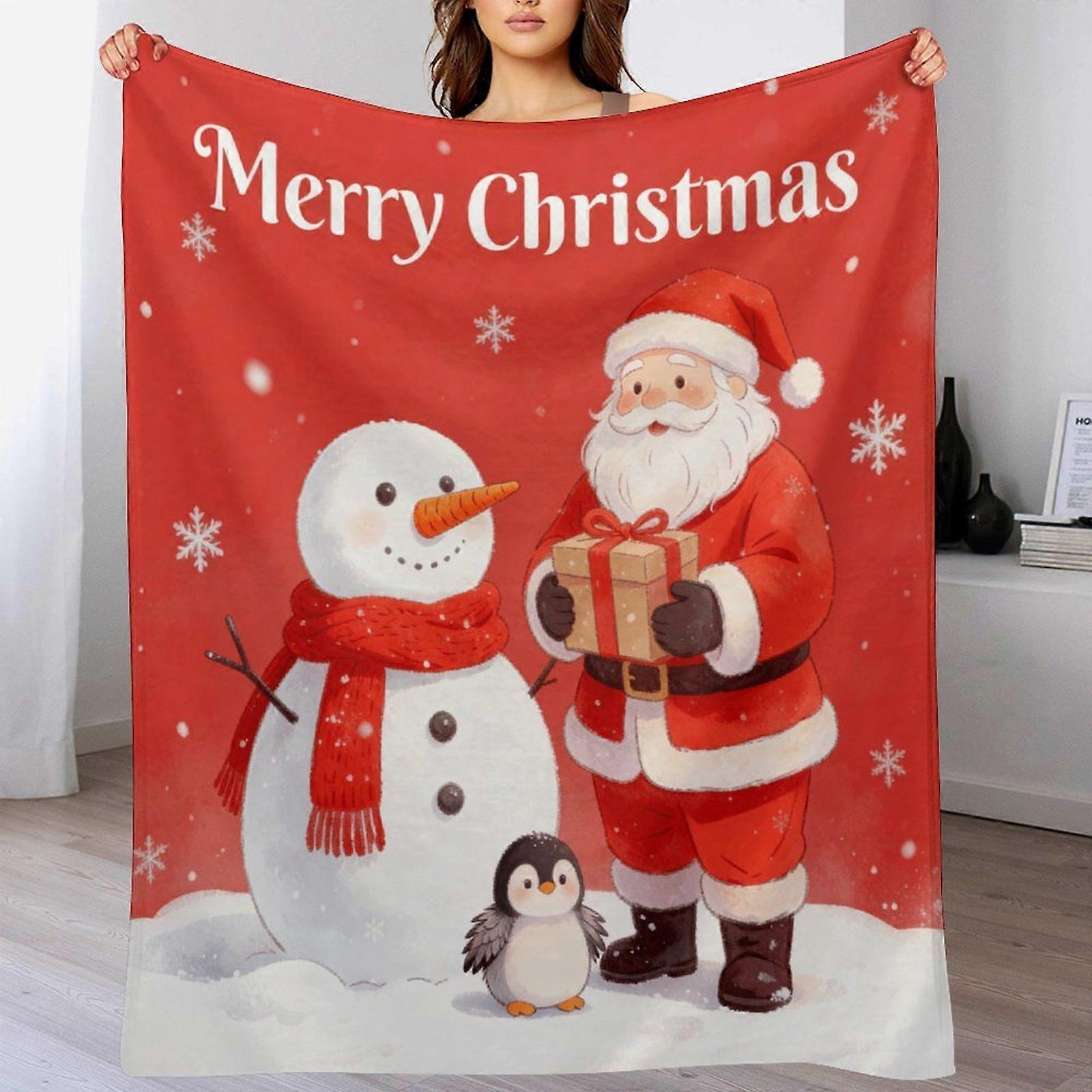 "Merry Christmas" Santa & Snowman Print Flannel Blanket - Soft Warm Throw for Living Room | Festive Gift for Families