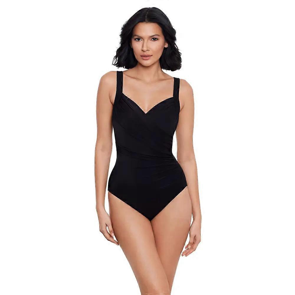 FEATURES Look 10 lbs. lighter in 10 seconds® Underwire bra V-neckline Strong tummy control Low scoopback with adjustable straps Moderate leg height Made from exclusive Miratex® fabric with LYCRA® XTRA LIFE™ Spandex Fabric composition: Body 69% Nylon, 31% LYCRA® Spandex, Drape 84% Nylon, 16% LYCRA® Spandex Model is 5'11" and wearing a size 8 The Sanibel Swimsuit in black by Miraclesuit is designed to beautifully shape and flatter your figure with the innovative Miratex® fabric that provides allover body control. Its slimming, sculpted fit includes a flattering V-neckline and underwire support for enhanced bust definition and comfort. The moderate leg cut offers just the right coverage, balancing style and modesty. Elegant front draping smooths the tummy area, discreetly shaping your silhouette to boost confidence. Perfect for those seeking a swimsuit that combines fashion with function, it’s ideal for a stylish, polished look at the pool or beach. Please note: the Miraclesuit swimwear is designed for a snug, supportive fit and has a firm control level. We recommend sizing up from your usual dress size if you prefer a more relaxed fit.