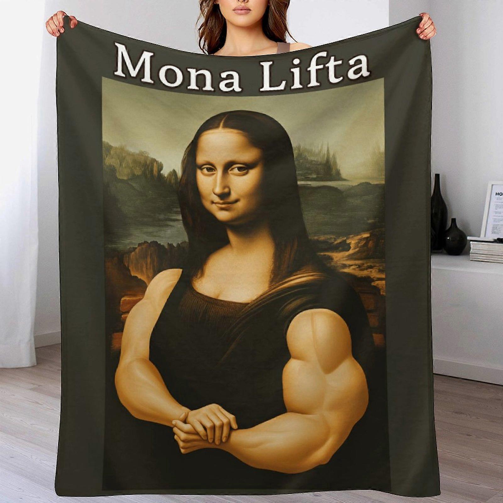 "Mona Lifta" Muscular Mona Lisa Print Flannel Blanket - Cozy Warm Throw | Funny Art Gift for Humor Lovers