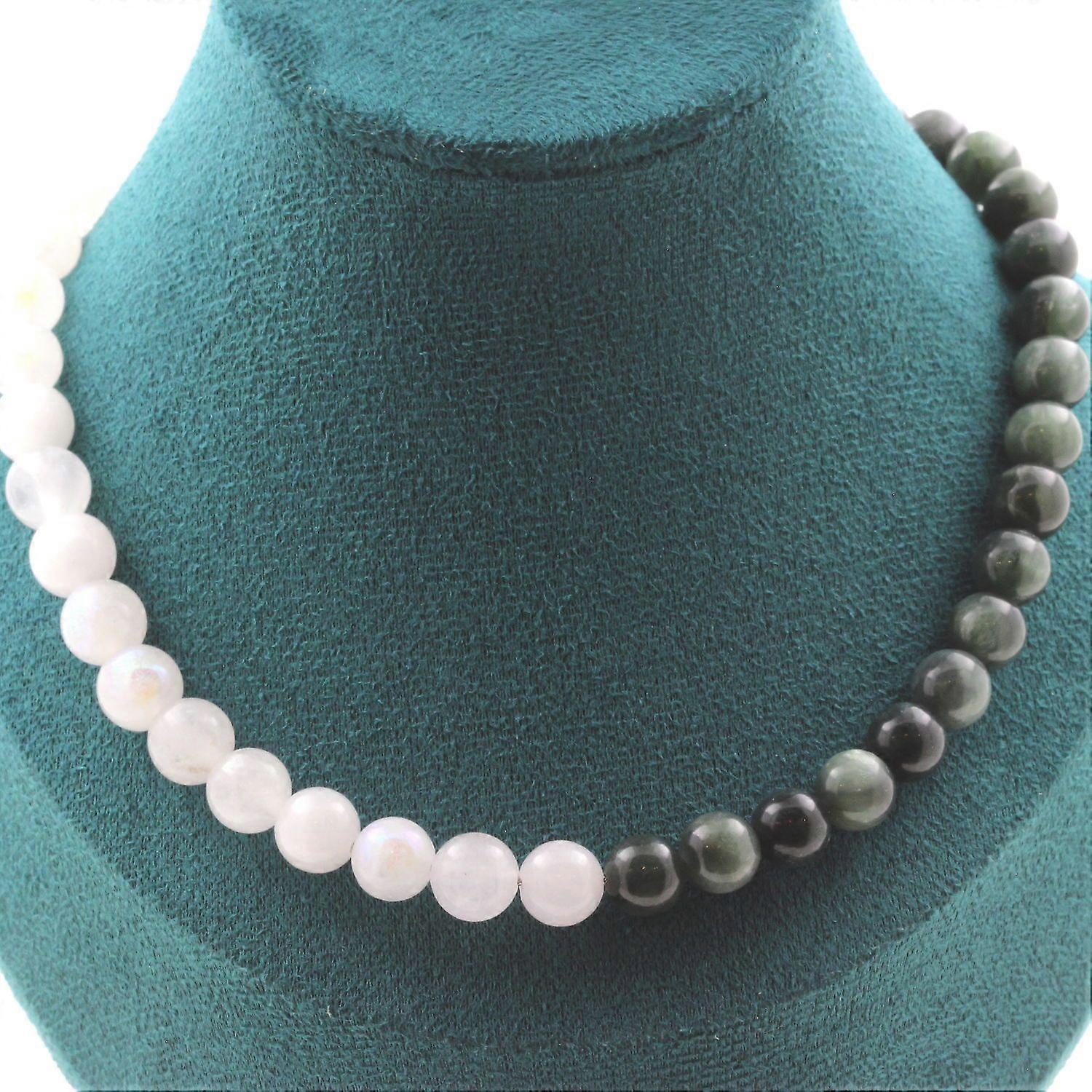 Moonstone + Russian Seraphinite beaded necklace 8 mm, stainless steel chain, length 45 cm. Made in France in the A Bijoux workshop. Delivered in a box pouch. Necklace for women, men, children. Ref. : SKU054956. Jewelry worn around the neck, often made of precious metals or adorned with precious and semi-precious stones.