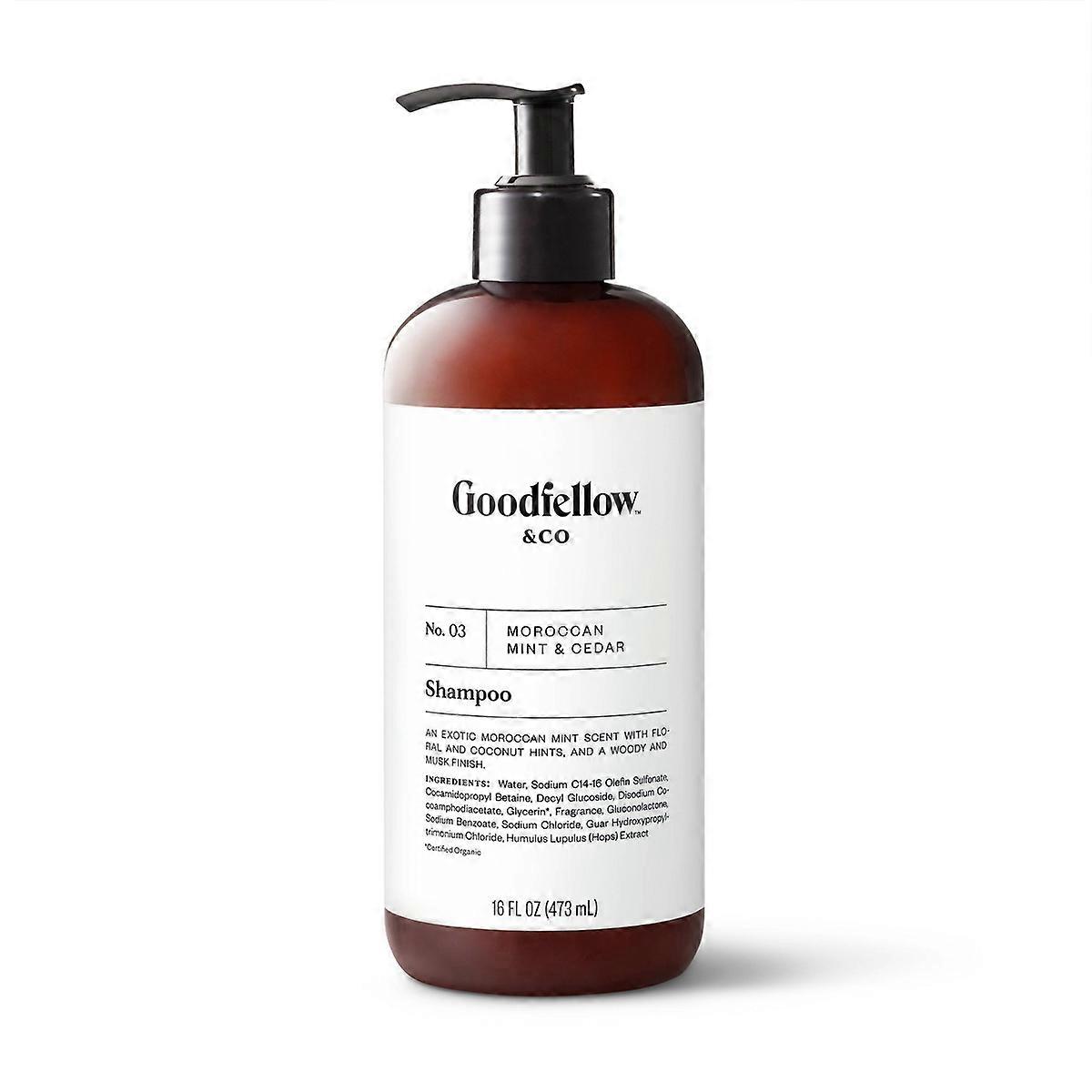 Whether you're headed to work or relaxing with friends, keep your hair looking — and smelling — its best with the No. 03 Moroccan Mint & Cedar Shampoo from Goodfellow & Co™. This scented moisturizing shampoo is made with hops extract and glycerin, giving you a refreshing formula that helps moisturize, hydrate, cleanse and add luster to your hair. The compelling Moroccan mint scent offers a fresh smell with floral and coconut notes, and a woody and musk finish provides a subtly masculine touch. Simply massage into your wet hair and scalp, lather and then rinse for an easy, thorough wash. 100% Satisfaction Guaranteed. No. 03 Moroccan Mint & Cedar scent offers a refreshing, subtly masculine smell Mint-scented shampoo helps you keep your hair looking and smelling great Made without silicones, sulfates, parabens or synthetic dyes Daily moisturizing shampoo lathers well and rinses completely clean for easy use Made with hops extract and glycerin to help provide a moisturizing, hydrating cleanse Directions: Massage into wet hair and scalp, lather and rinse. Follow with conditioner. Ingredients: Water, Sodium C14-16 Olefin Sulfonate, Cocamidopropyl Betaine, Decyl Glucoside, Disodium Cocoamphodiacetate, Glycerin*, Fragrance, Gluconolactone, Sodium Benzoate, Sodium Chloride, Guar Hydroxypropyltrimonium Chloride, Humulus Lupulus (Hops) Extract *Certified Organic Allergies: WARNING: External use only. Avoid eye contact. If contact occurs, rinse immediately with water. Keep out of reach of children.