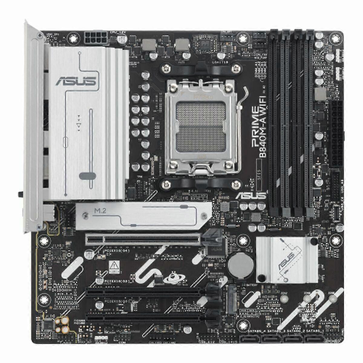 The ASUS PRIME B840M-A WIFI motherboard, model 90MB1J20-M0EAY0, is a robust and versatile solution designed for systems with AMD processors, featuring the AMD AM5 socket and the AMD B840 chipset, ensuring compatibility and efficient performance for modern gaming and general use setups. Its MicroATX (mATX) form factor supports compact builds without sacrificing functionality, ideal for users seeking to optimize space while retaining expansion options. It stands out by integrating next-generation connectivity with support for Intel Wi-Fi 6, ensuring stable and fast wireless connections, essential for multitasking environments and smooth data streaming. Regarding ports and connectivity, it offers HDMI outputs for easy connection to monitors and TVs, and includes multiple USB and USB-C interfaces, facilitating connection of modern peripherals and external storage devices. Its gray-toned design provides a discreet and professional look, while compatibility with current AMD technologies ensures support for the latest architectures, optimizing processor performance and power management. This motherboard is intended for users needing a solid foundation to build a balanced system that combines effective processing power and advanced connectivity within a compact, functional format. In short, the ASUS PRIME B840M-A WIFI represents a reliable and up-to-date platform for computing projects with AMD technologies and modern networking and multimedia demands.