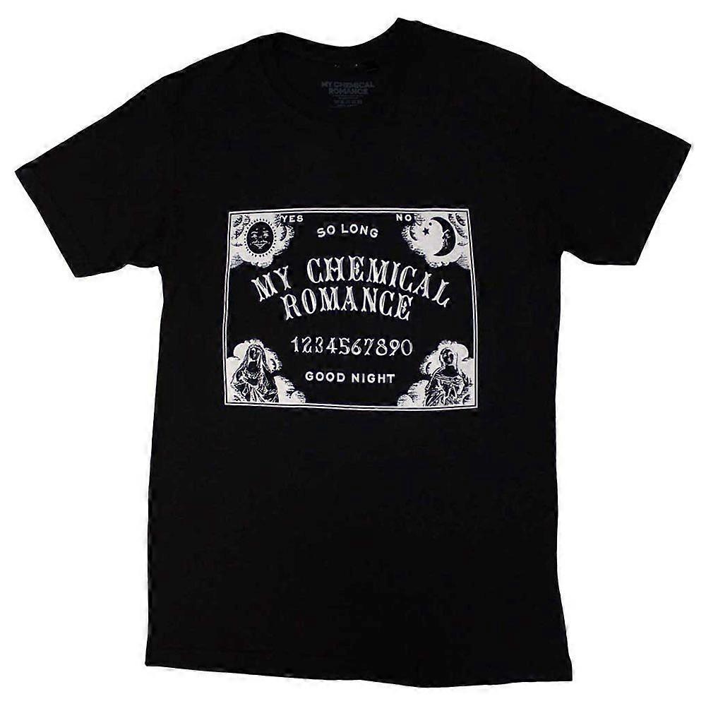 Official licensed My Chemical Romance Unisex T-Shirt featuring the 'Goodnight' design motif. High quality T-Shirt available in a black colourway. High quality soft-style cotton unisex t-shirt featuring front printing. Comes in a wide range of sizes from Small through XX-Large, subject to availability