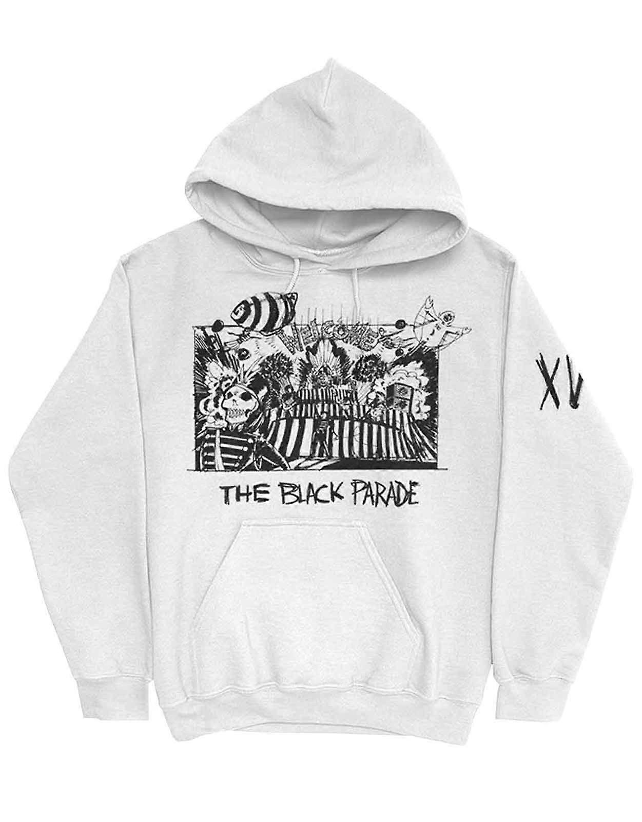 An official licensed My Chemical Romance Unisex Pullover Hoodie featuring the 'XV Marching Frame' design motif. This high quality Pullover Hoodie is available in a white colourway. High quality long sleeved pullover hooded top with hood and pouch pockets, features front and back printing. Comes in a wide range of sizes from Small through XX-Large, subject to availability.
